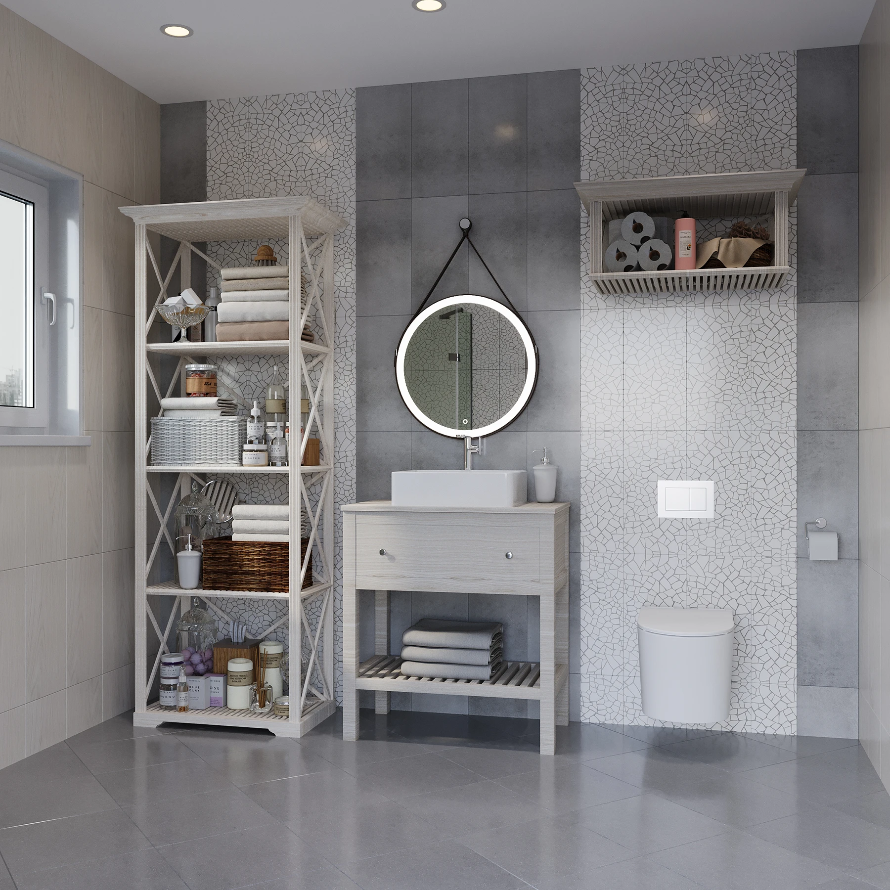 - Стремление к простору и порядку. На виду не должно быть ничего лишнего. Хранить косметику удобно в навесном шкафчике с зеркалом или закрытых полках. Для размещения текстиля, аксессуаров и уборочного инвентаря можно использовать шкаф-пенал, стеллаж, корзины и контейнеры, а бытовую химию спрятать в тумбу под раковиной.