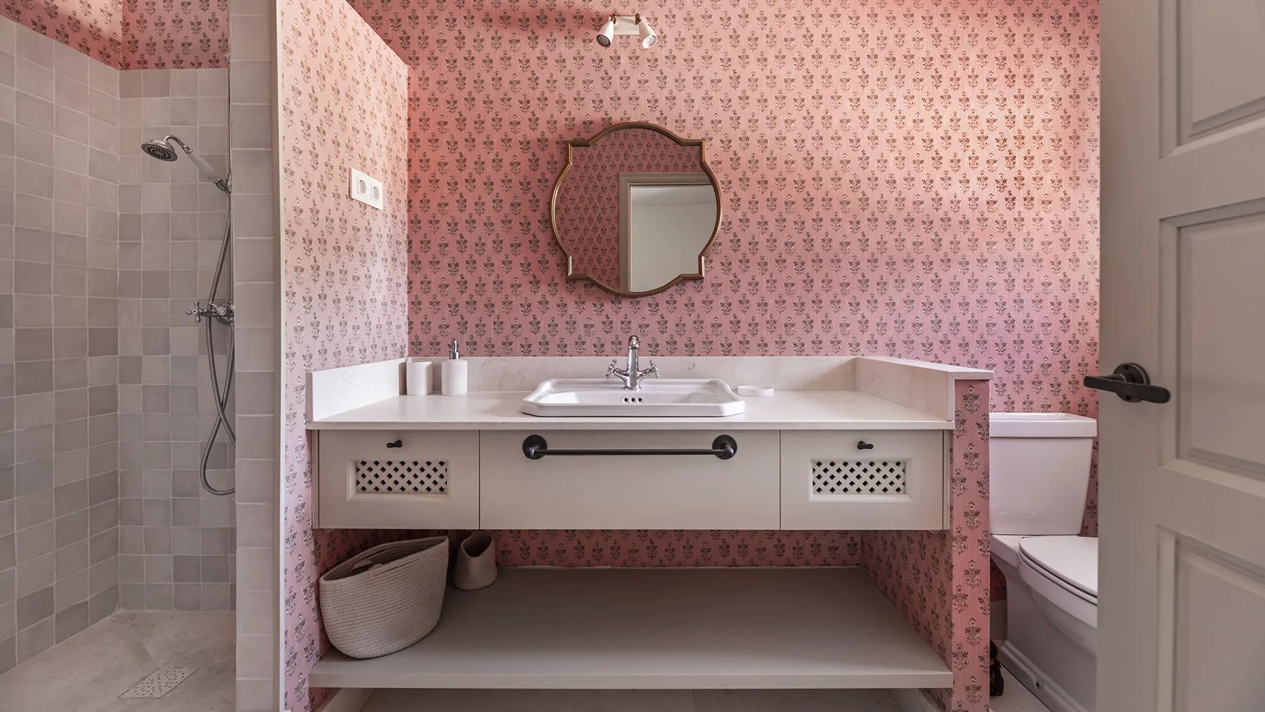 Сухие зоны, в которых нет прямого контакта с водой, можно покрасить или оклеить обоями. Краску наносят не только на стены, но и потолок — это бюджетный и практичный вид отделки. Покраска и обои хорошо сочетаются с плиткой и керамогранитом.