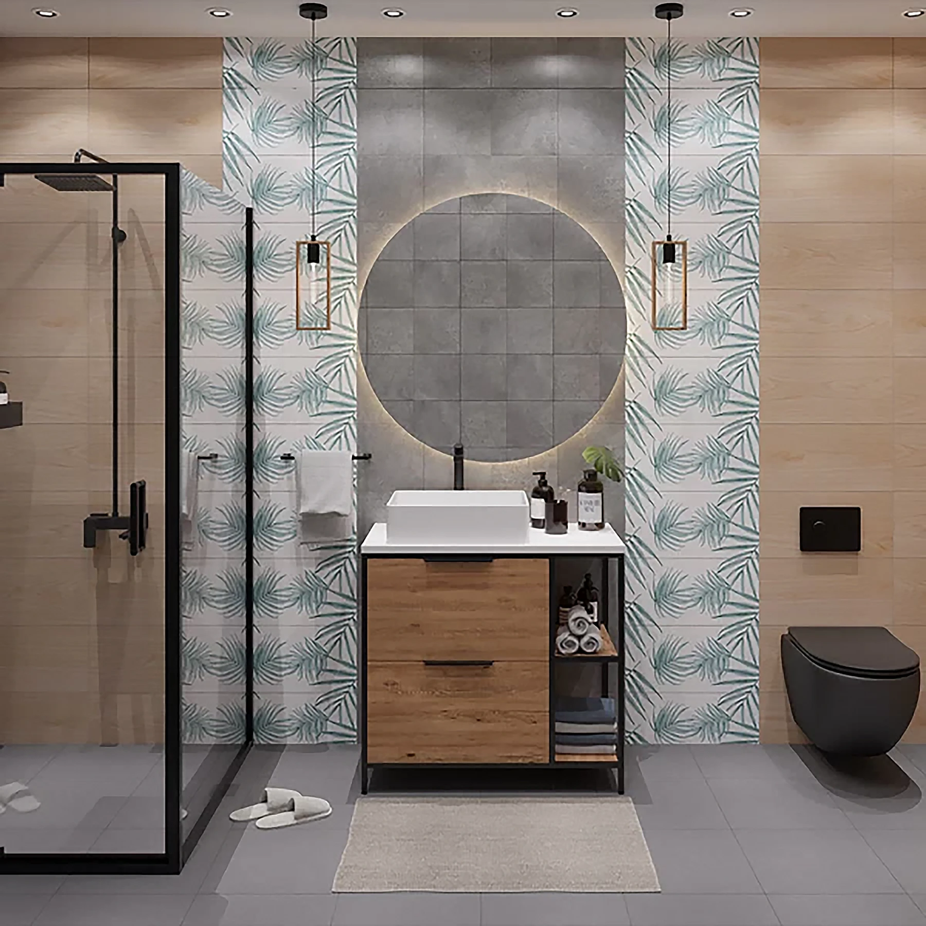 Можно добавить природный принт на плитке или обоях. Например, растительный орнамент из коллекции Lavelly City Jungle. Акцентные полосы дополнены плиткой под дерево в зоне душа и за унитазом и плиткой под бетон в зоне раковины.