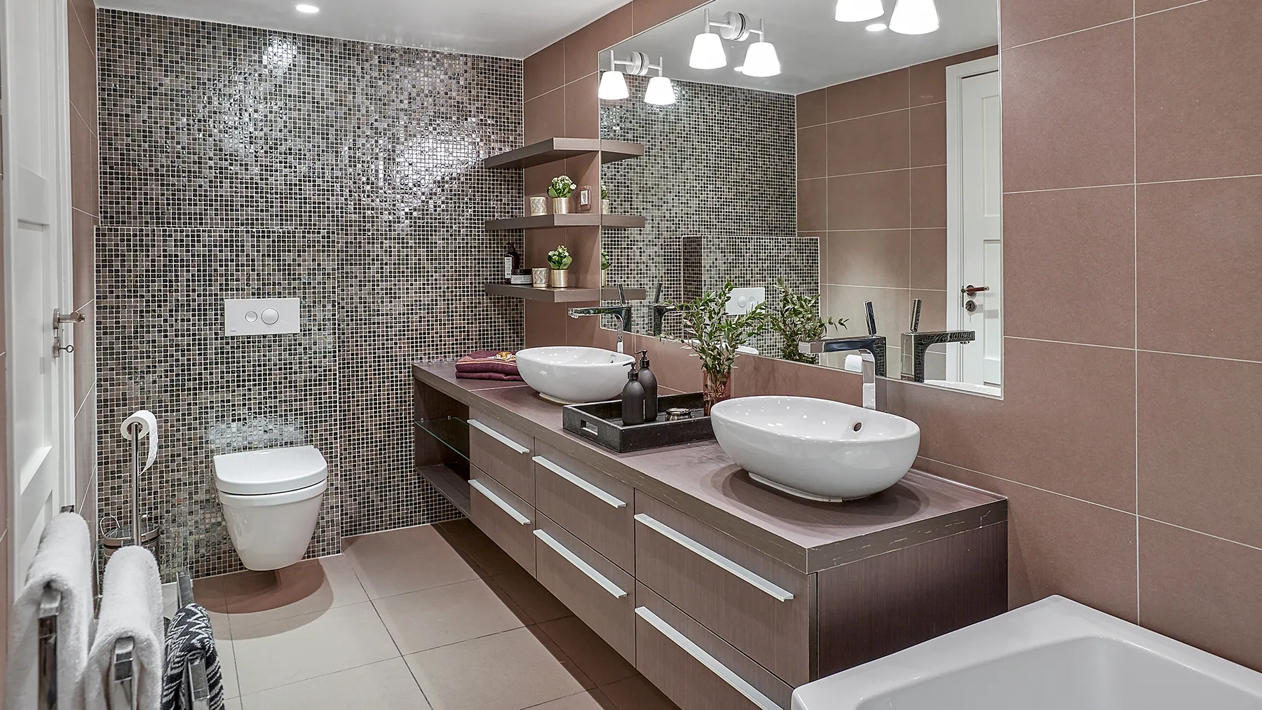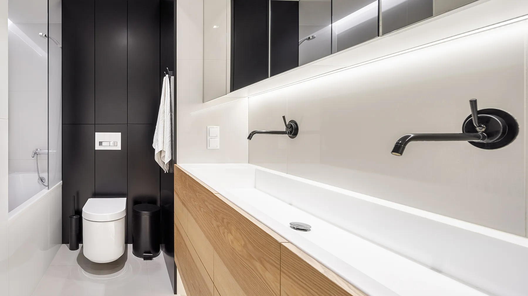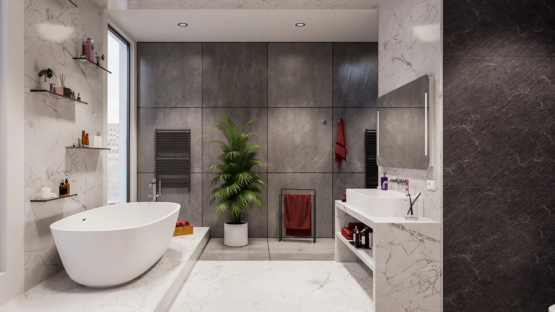 В отделке используйте влагоустойчивые, практичные и прочные материалы. В 2025 году модно миксовать материалы, фактуры и цвета.