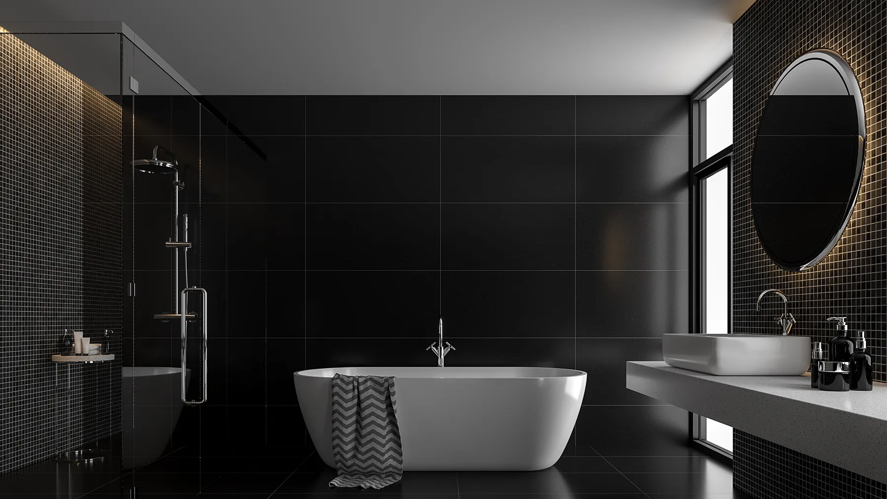 Актуальны темные интерьеры с оттенками черного, темно-серого, темно-коричневого, темно-синего и графитового. Но это решение подходит только для просторных ванных, поскольку зрительно сужает пространство.