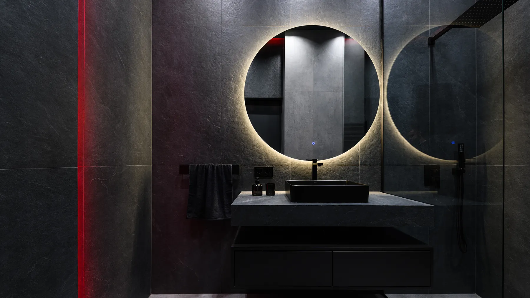 Интерьер в темном цвете — элегантный и глубокий. А его современность подчеркнут металлические элементы, технологичная сантехника, аксессуары и подсветка.