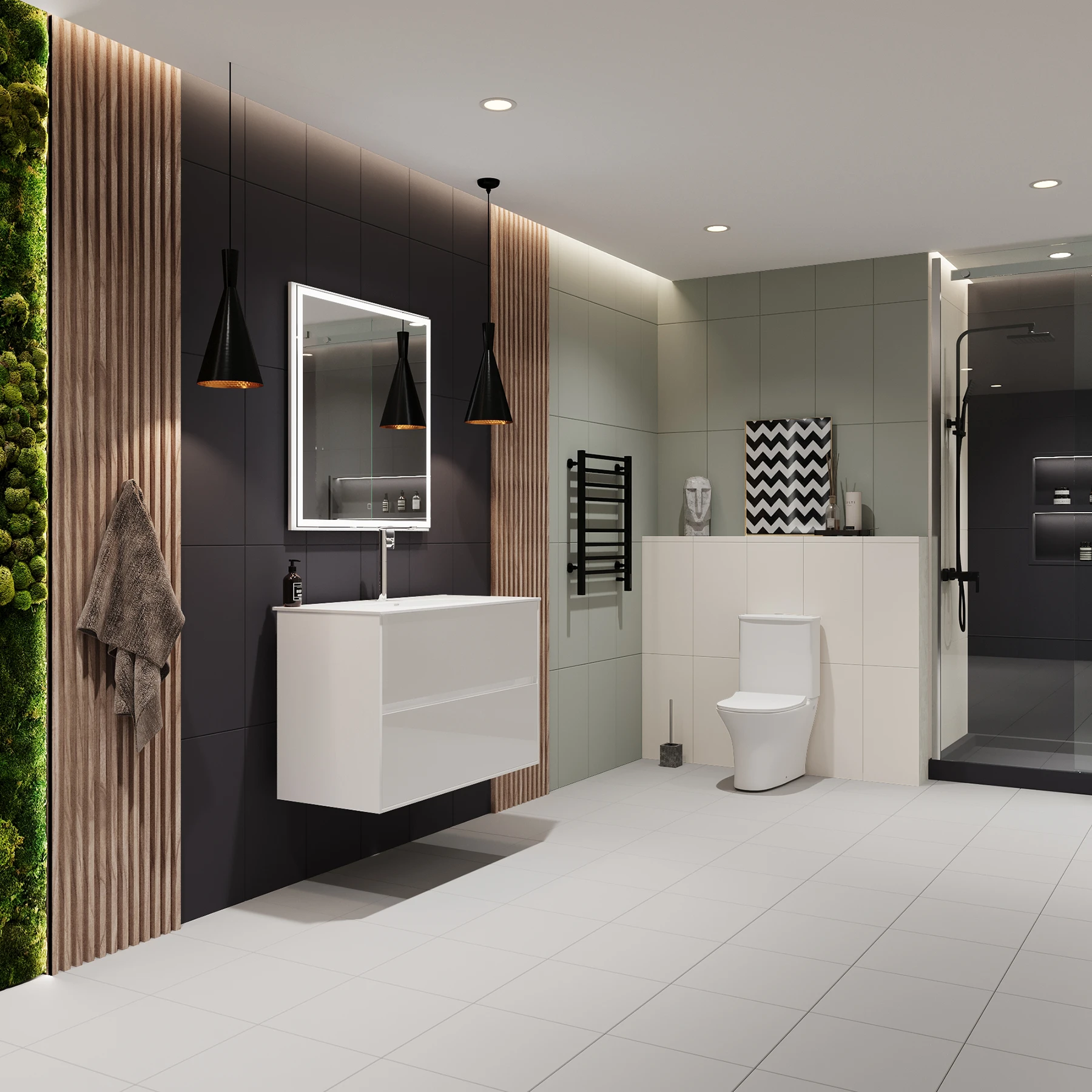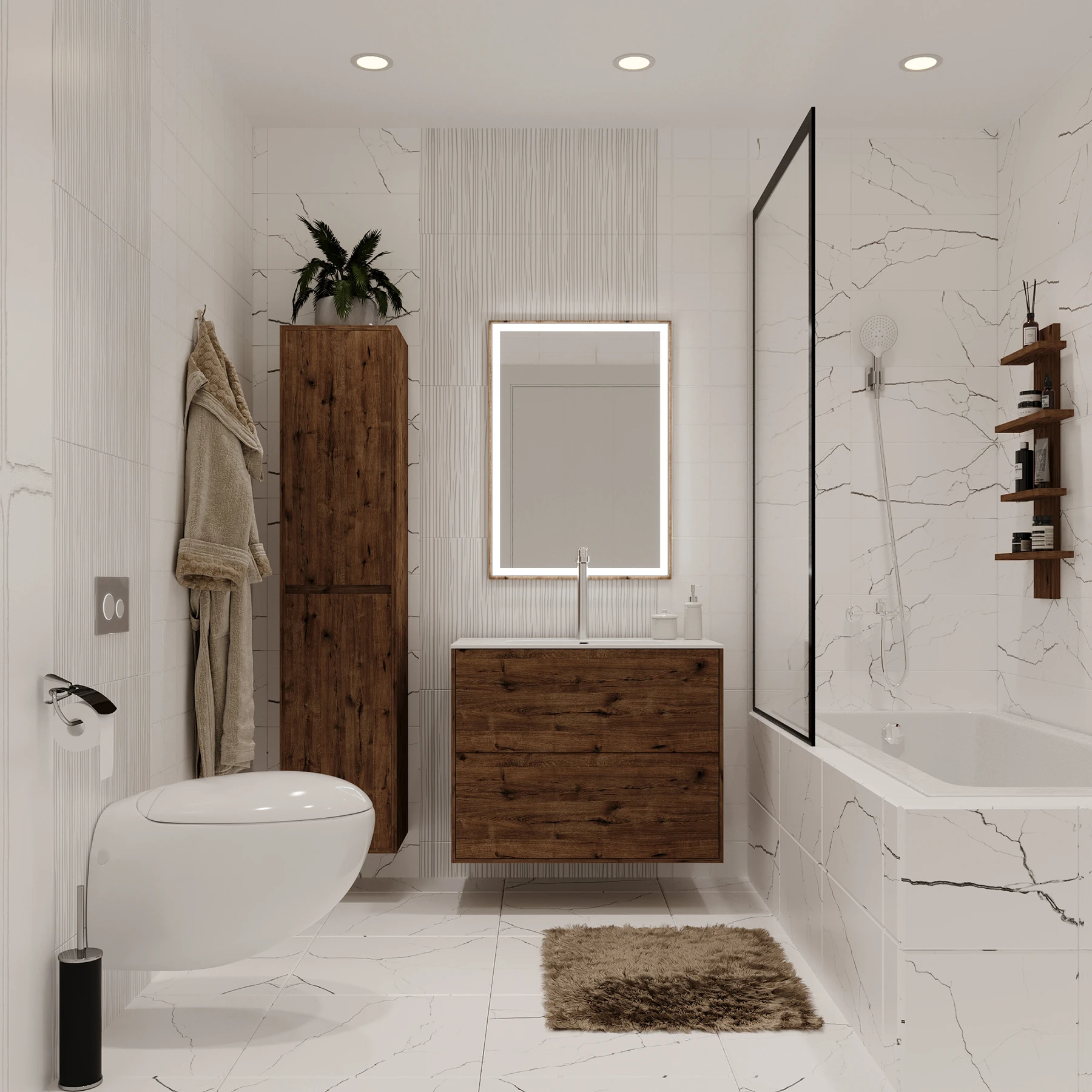 В этом стиле создана капсульная коллекция Lavelly Skandi Marble. В основе дизайна ванной — плитка под белый мрамор, а акцент интерьера — рельефная отделка зоны раковины и за унитазом. Близость к природе подчеркивают подвесная мебель из древесины и живое растение.