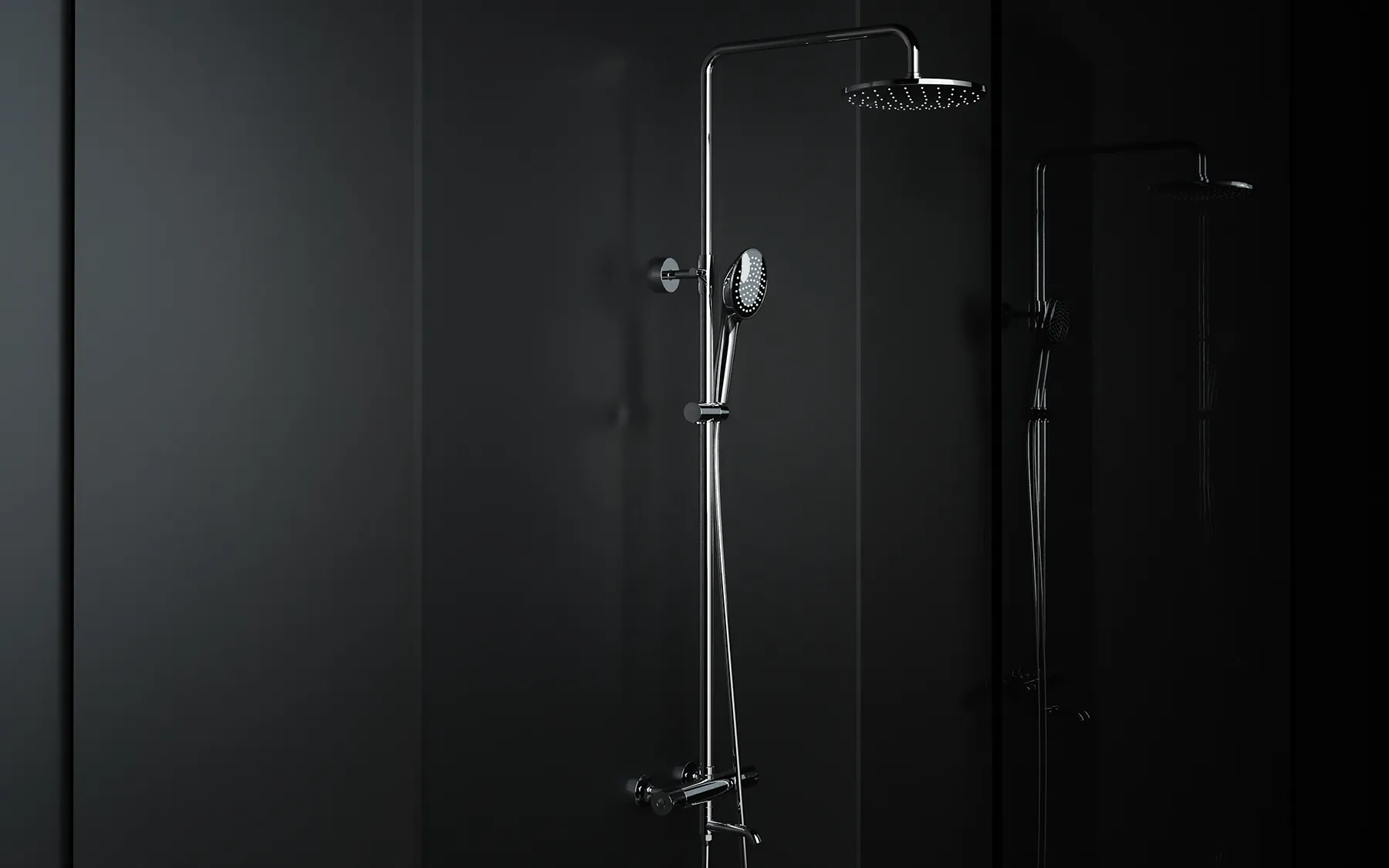 Современный интерьер ванной можно дополнить стильной душевой системой с термостатом и эффектом тропического душа. Это и красивое, и функциональное решение.
