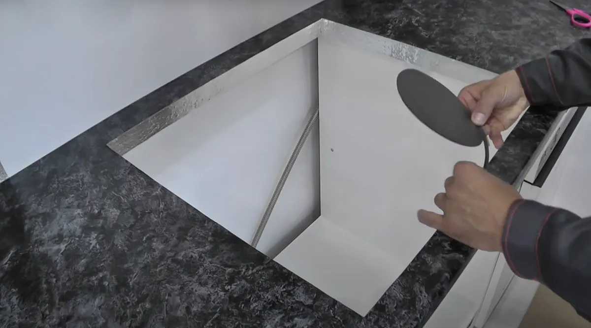 Чтобы установить варочную панель, также очистите отверстие под нее от пыли и мусора и обработайте торец обезжиривателем. Затем по периметру нанесите герметик и положите уплотнитель — он идет в комплекте с панелью.