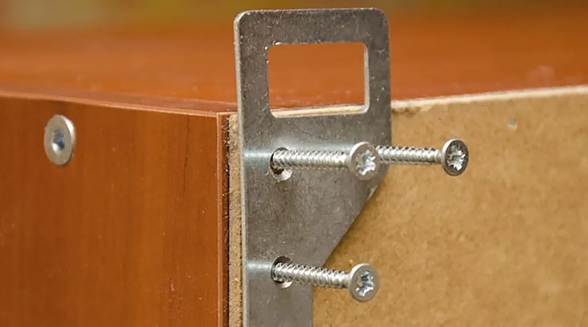 Когда вырезы под мойку и варочную панель готовы, установите столешницу на нижние шкафы, собранные в секцию. Для этого возьмите уголки для крепления и с помощью саморезов прикрутите их на стенки шкафов. Уголки должны идти вровень с торцом модуля.