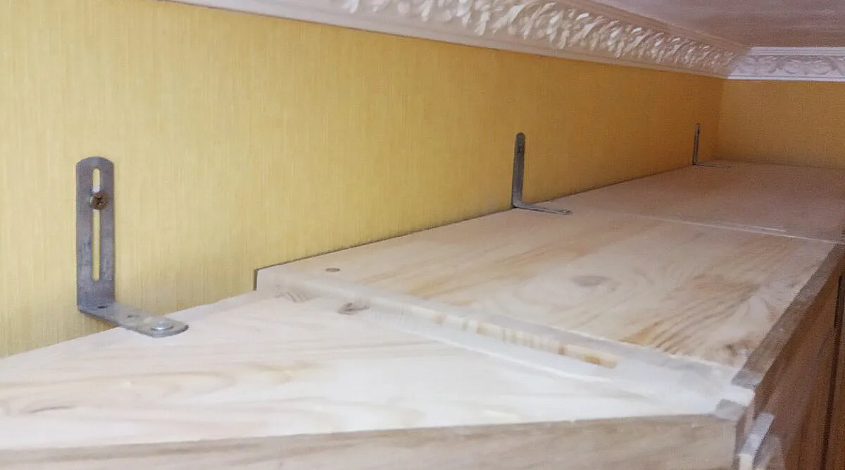 Простые навесы нужно установить выше границы верхнего модуля на размер петли. Отмерьте это расстояние вверх от линии верхней границы гарнитура и отметьте на стене места под анкеры. Петли прикручивают сквозь заднюю стенку к торцу боковой стенки шкафа, а уголок — к верхней стенке шкафа саморезами. К стене уголки и петли прикрепляют анкерами.