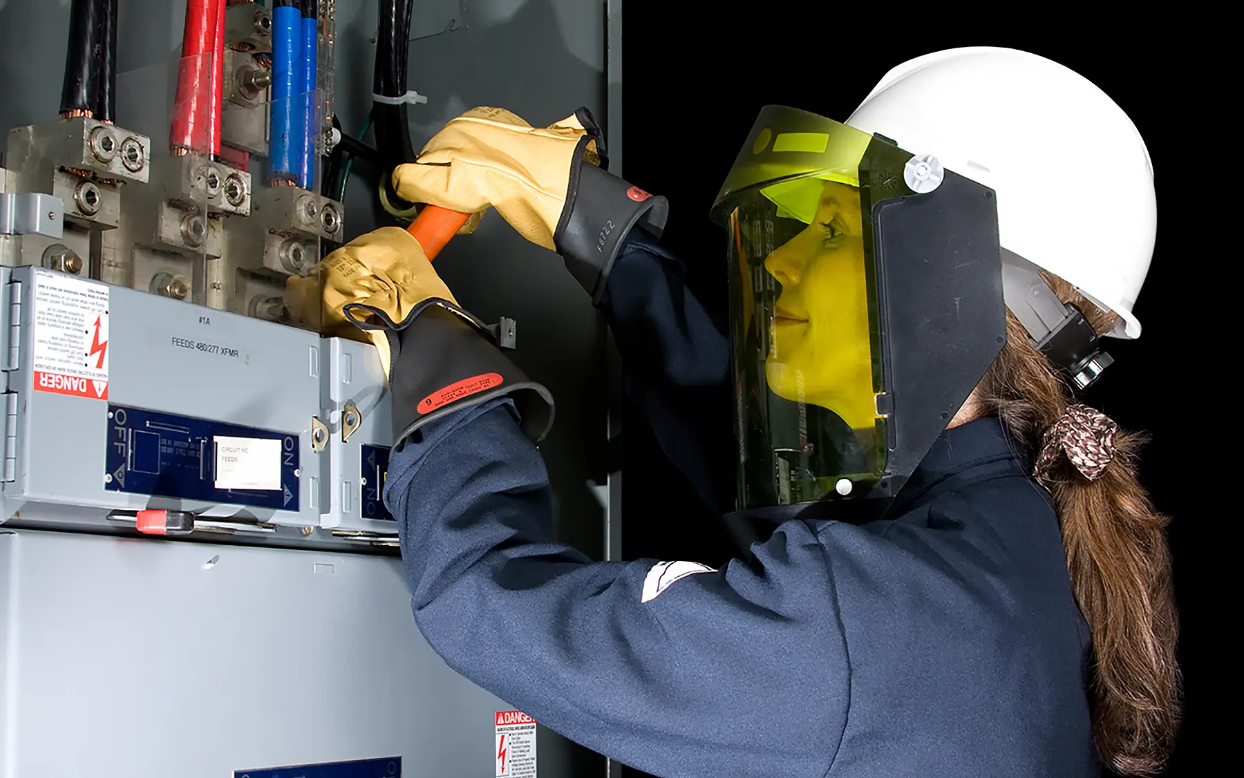 Чтобы защитить голову, электромонтажнику понадобится термоустойчивая поликарбонатная каска с дополнительным щитком и подшлемником. Поверх термостойких перчаток надевают диэлектрические, когда работают под напряжением. Глаза электрик защищает поликарбонатными очками.