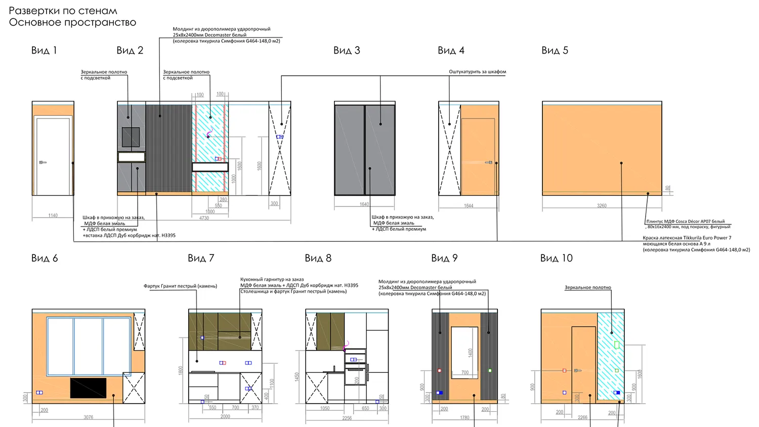 - развертку по стенам с расположением оконных проемов, дверей, систем отопления, водоснабжения и других инженерных коммуникаций