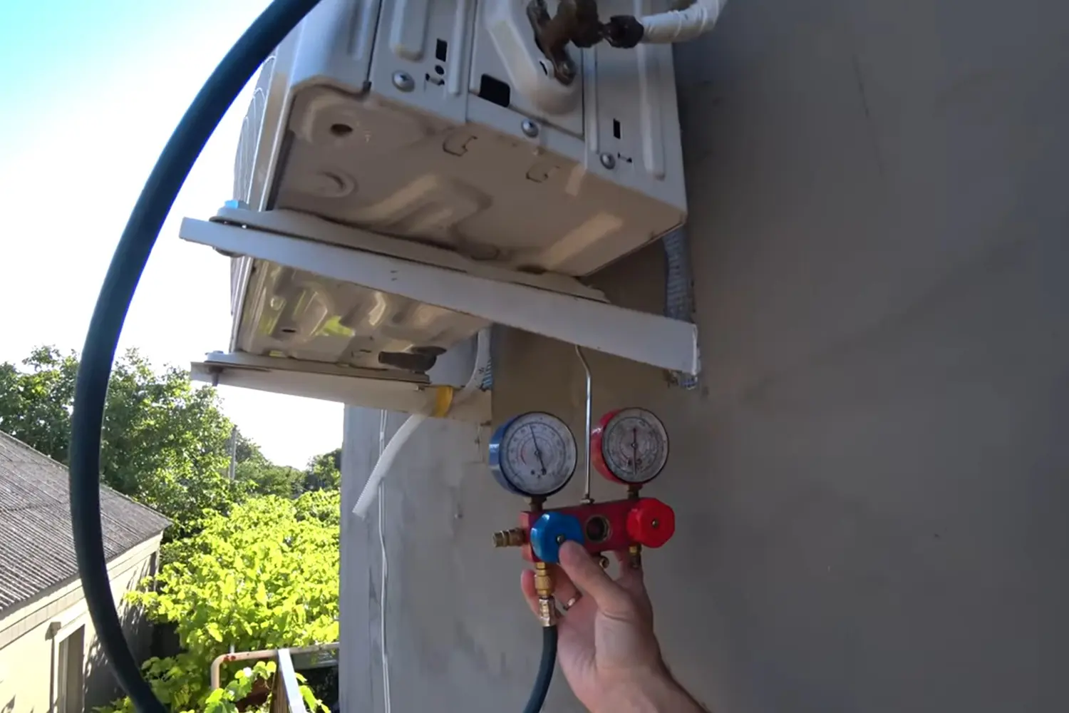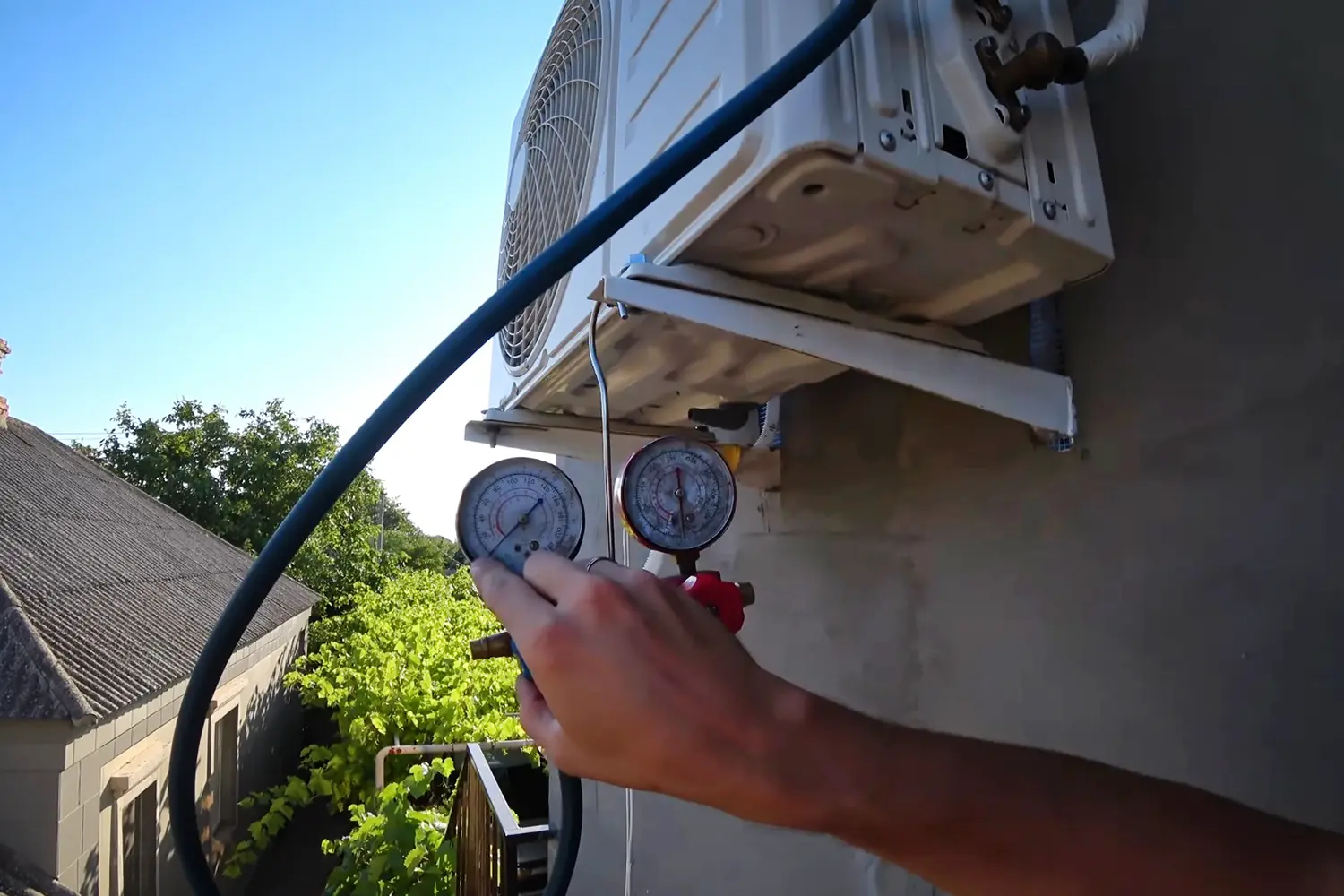 Подключите манометр к сервисному порту. Для этого открутите заглушки на кранах наружного блока. Один из шлангов манометра подсоедините к штуцеру на толстой трубке. Убедитесь, что соединение плотное.