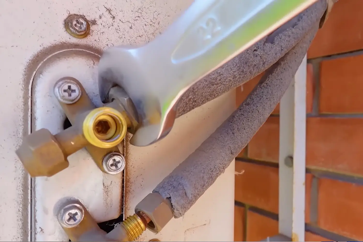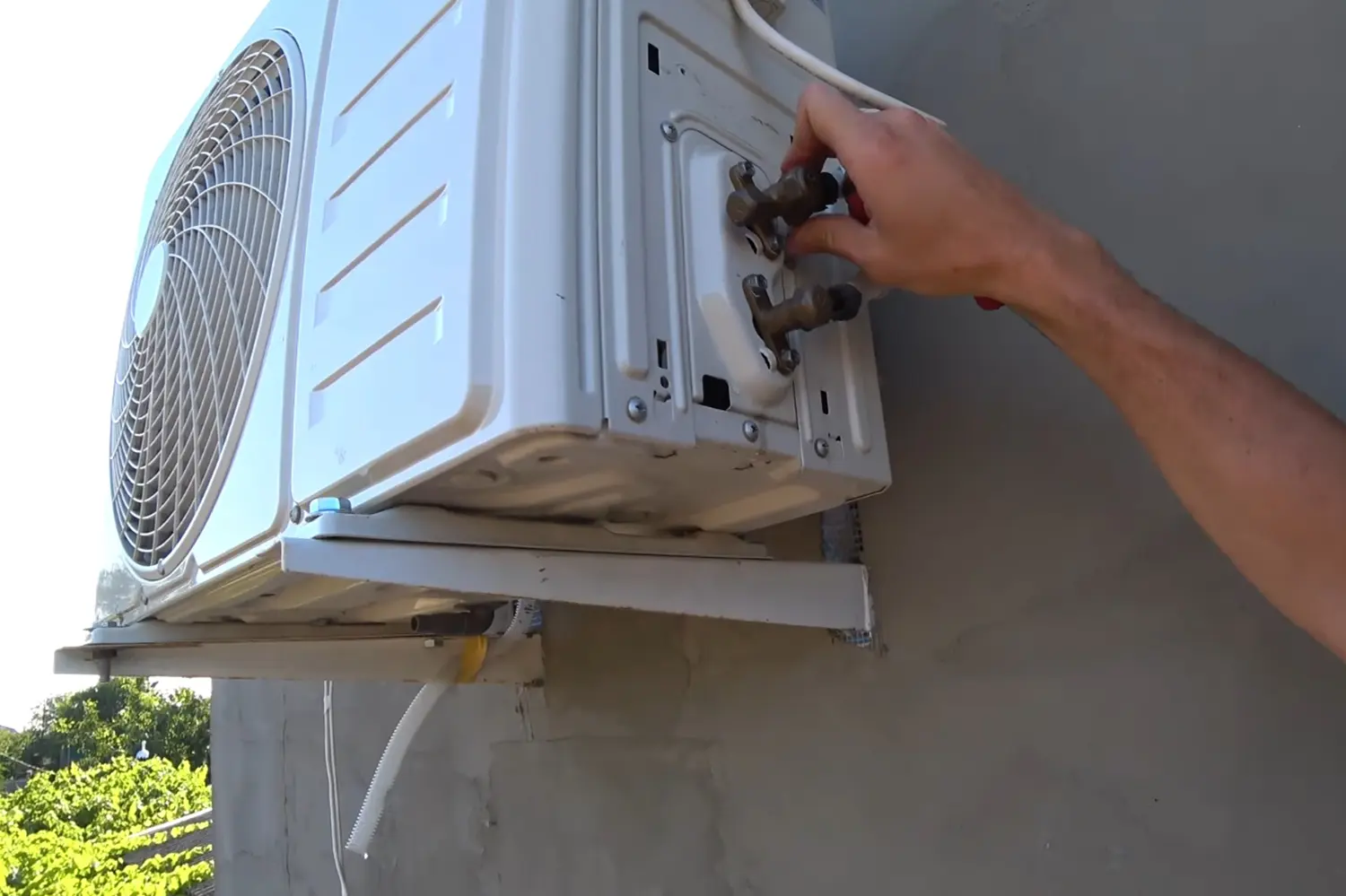 На задней или боковой стороне наружного блока найдите штуцеры, к которым подключены медные трубки. Открутите накидные гайки ключом и закройте штуцеры штатными медными колпачками или резиновыми заглушками — так в них не попадет пыль и грязь.