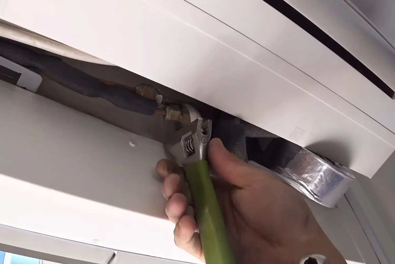 На задней стороне внутреннего блока найдите два штуцера. Это выходы для медных трубок: тонкая — жидкостная линия (подача хладагента), толстая — газовая линия (возврат пара). Каждая трубка соединена с блоком через накидную гайку, которая накручена на штуцер и герметизирует соединение. Открутите обе гайки с помощью накидного ключа (предпочтительно) или разводного ключа подходящего размера.