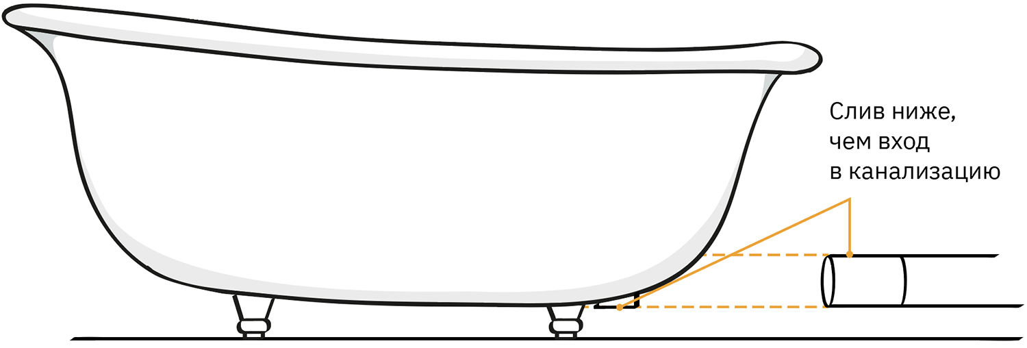 Чтобы вода уходила, слив ванны надо приподнять над уровнем пола так, чтобы он был выше, чем вход в канализацию.