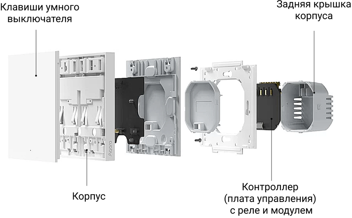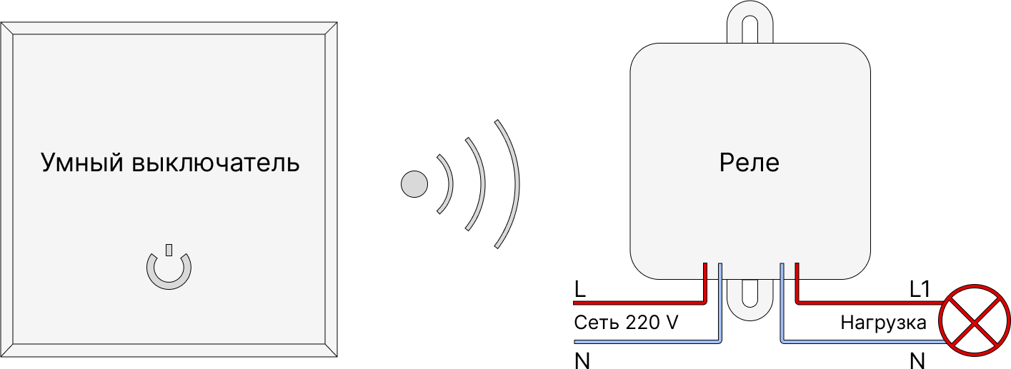 Конструктивно умный выключатель света — это компактный модуль с приемником сигнала, контроллером и исполнительной частью — реле. Приемник получает сигнал и передает его на контроллер, который включает или отключает реле, отвечающее за подачу напряжения или обесточивание сети.