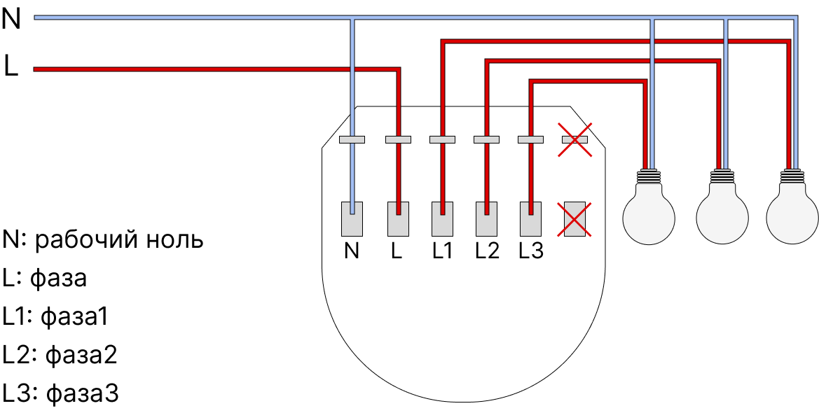Если у вас в подрозетнике есть нулевой провод (обычно синий), подключите его к соответствующему контакту на выключателе (N), а фазу от распределительной коробки подведите к гнезду с отметкой L. Фазные провода, которые идут к светильникам (потребителям), подключайте к рабочим контактам L1, L2 и т. д.
