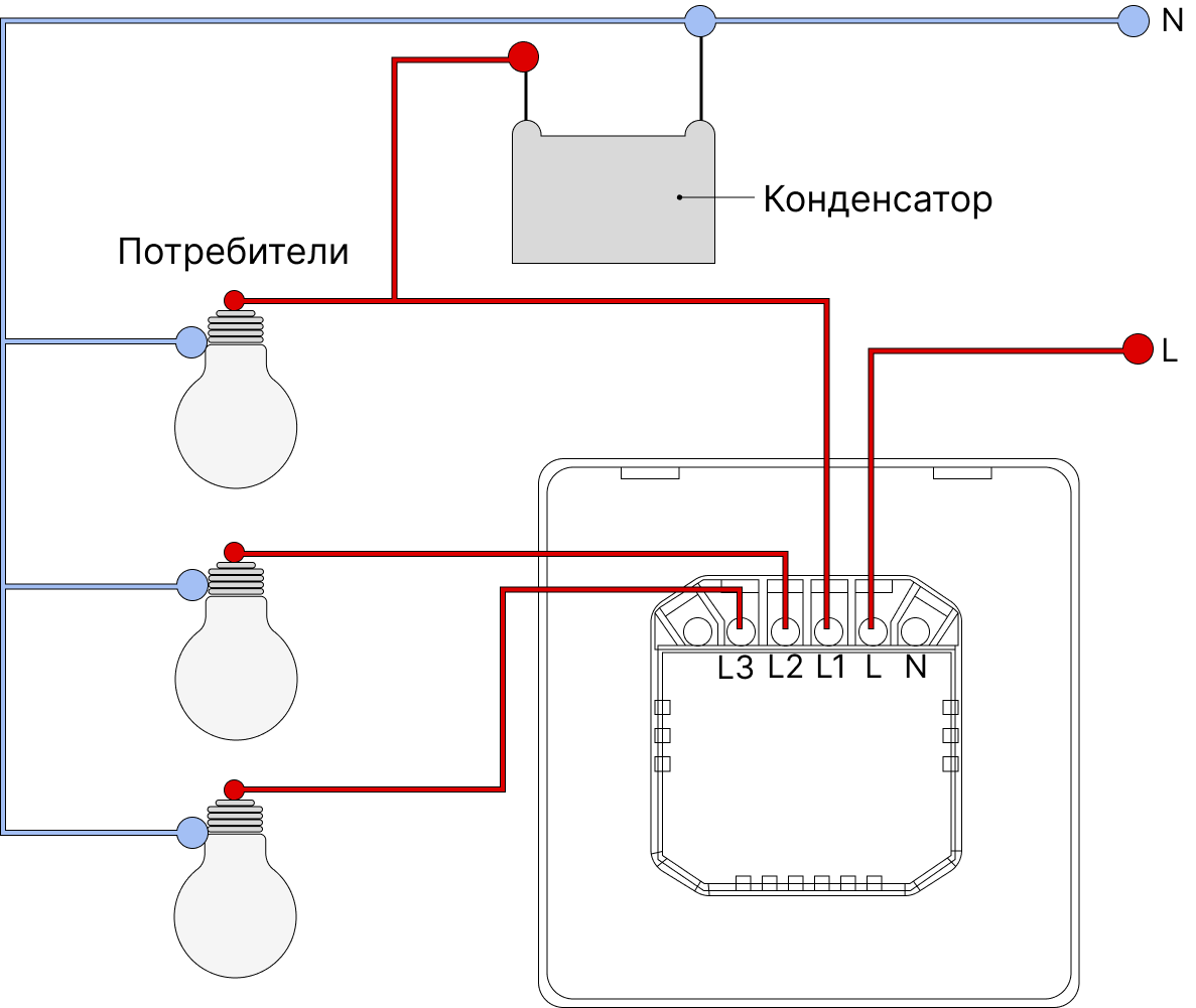 Если в подрозетнике нет нулевой линии, нужно дополнительно установить конденсатор. Он должен входить в комплект к умному прибору. Конденсатор вы можете установить в распределительную коробку или светильник, которым будет управлять выключатель. Его подключают к нулевой линии и проводу, который соединяется с выходом выключателя L1.