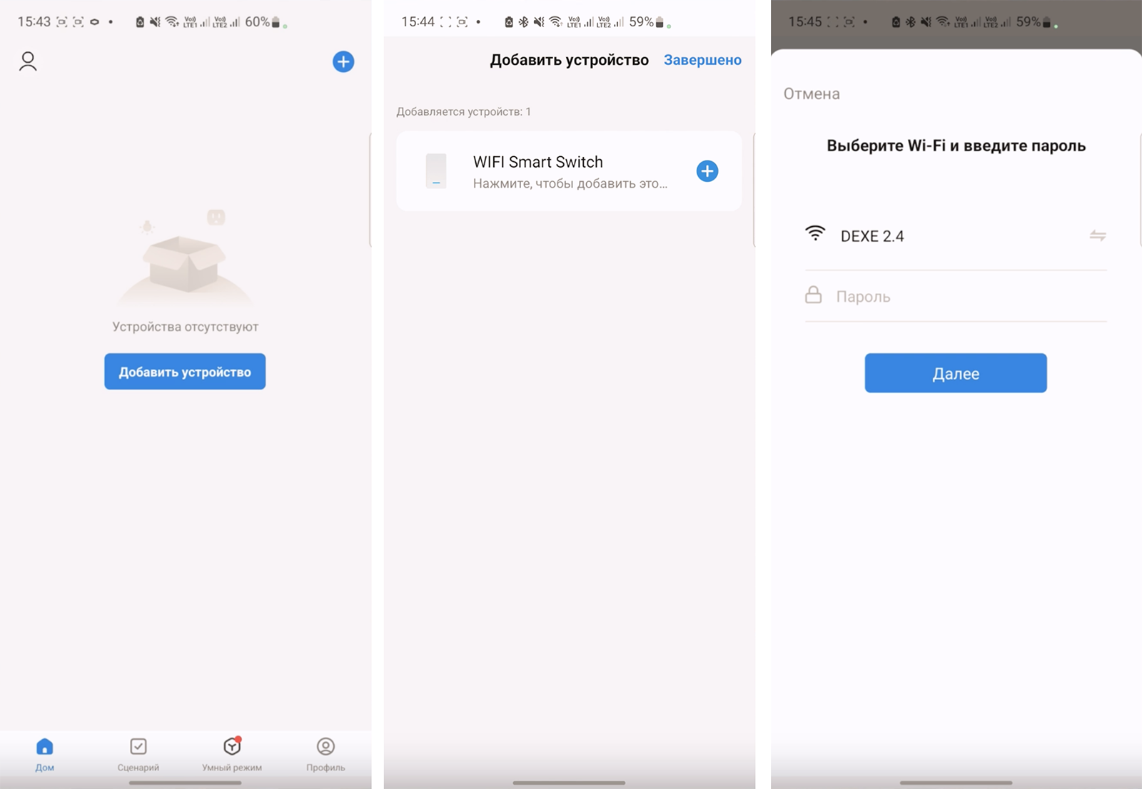 Запустите в приложении опцию добавления и поиска нового устройства. Дождитесь, когда оно будет найдено, и выберите его из списка. Введите данные сети (логин и пароль) для подключения к ней умного выключателя.