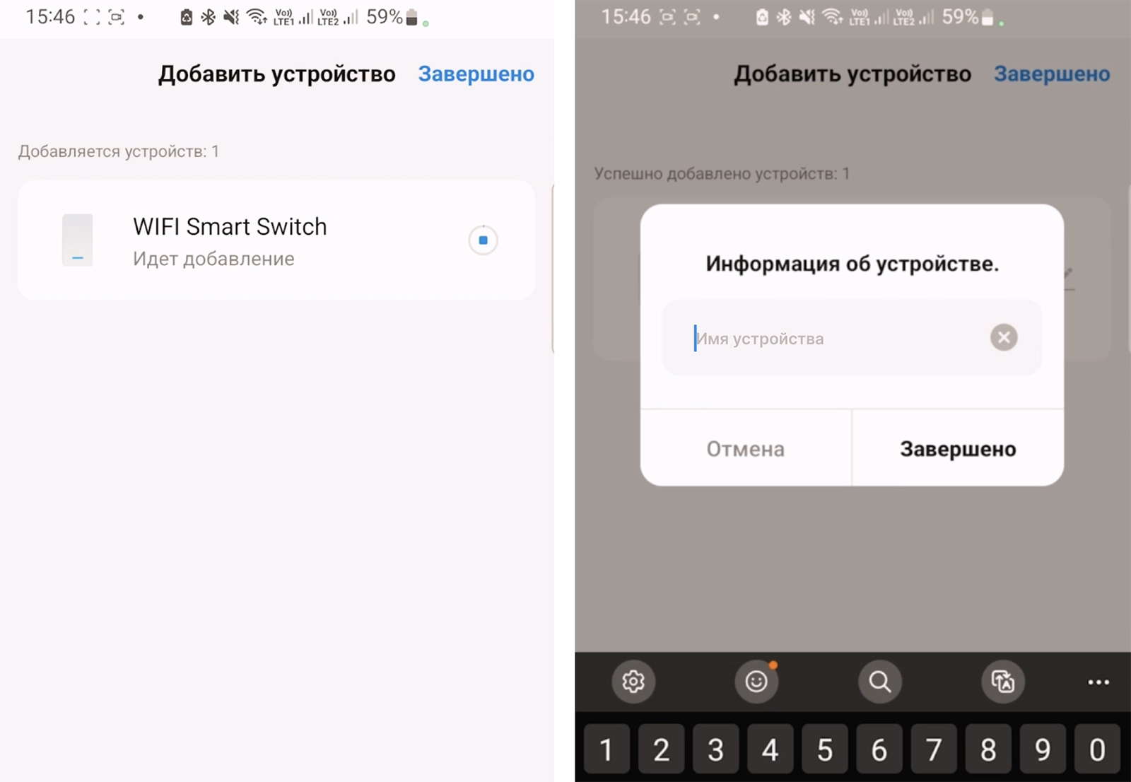 После этого запустится процесс синхронизации, умный выключатель появится в списке доступных устройств. Задайте ему название и нажмите «Завершено».