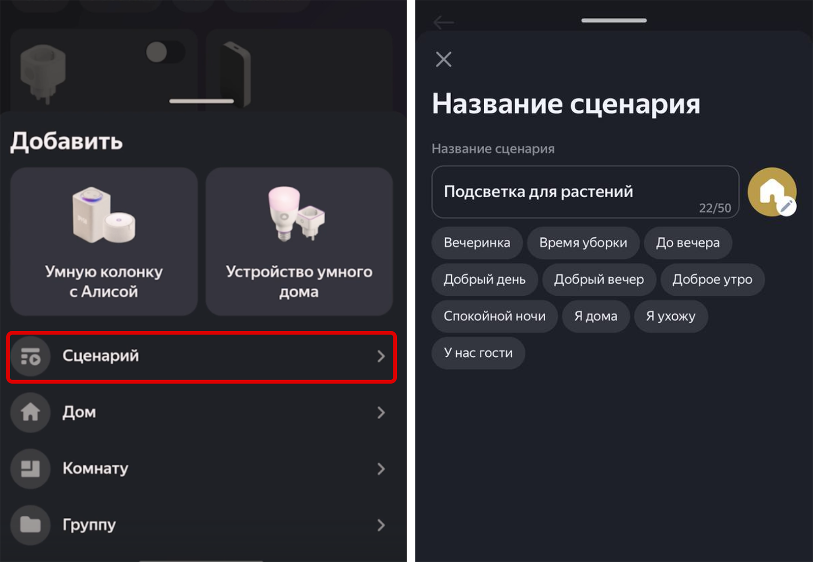 Зайдите в приложение Яндекса на телефоне, выберите выключатель и перейдите во вкладку «Сценарии». Задайте название — в нашем случае установим расписание для подсветки растений.