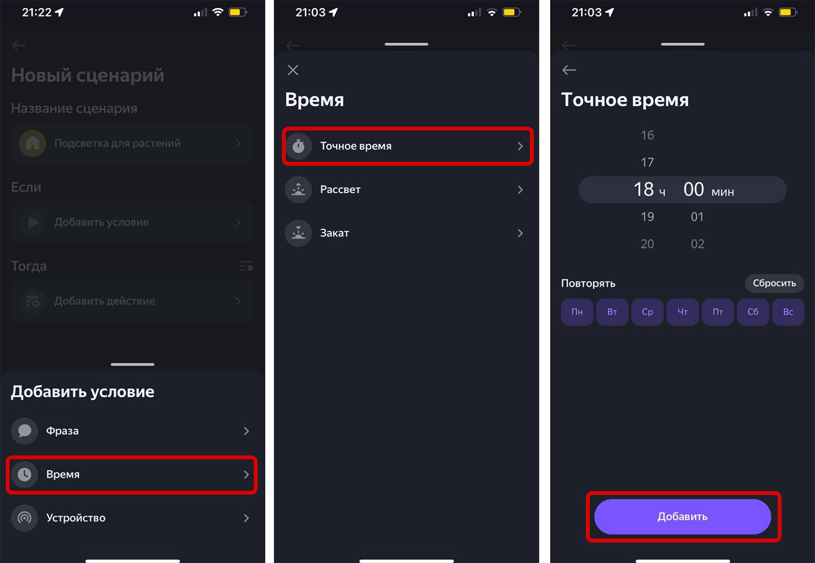 Настройте условия и триггеры сценария, которые предложит приложение. Например, установите расписание — для этого перейдите в меню «Время». Укажите время, выберите дни недели, в которые будет запускаться событие. Нажмите «Добавить».