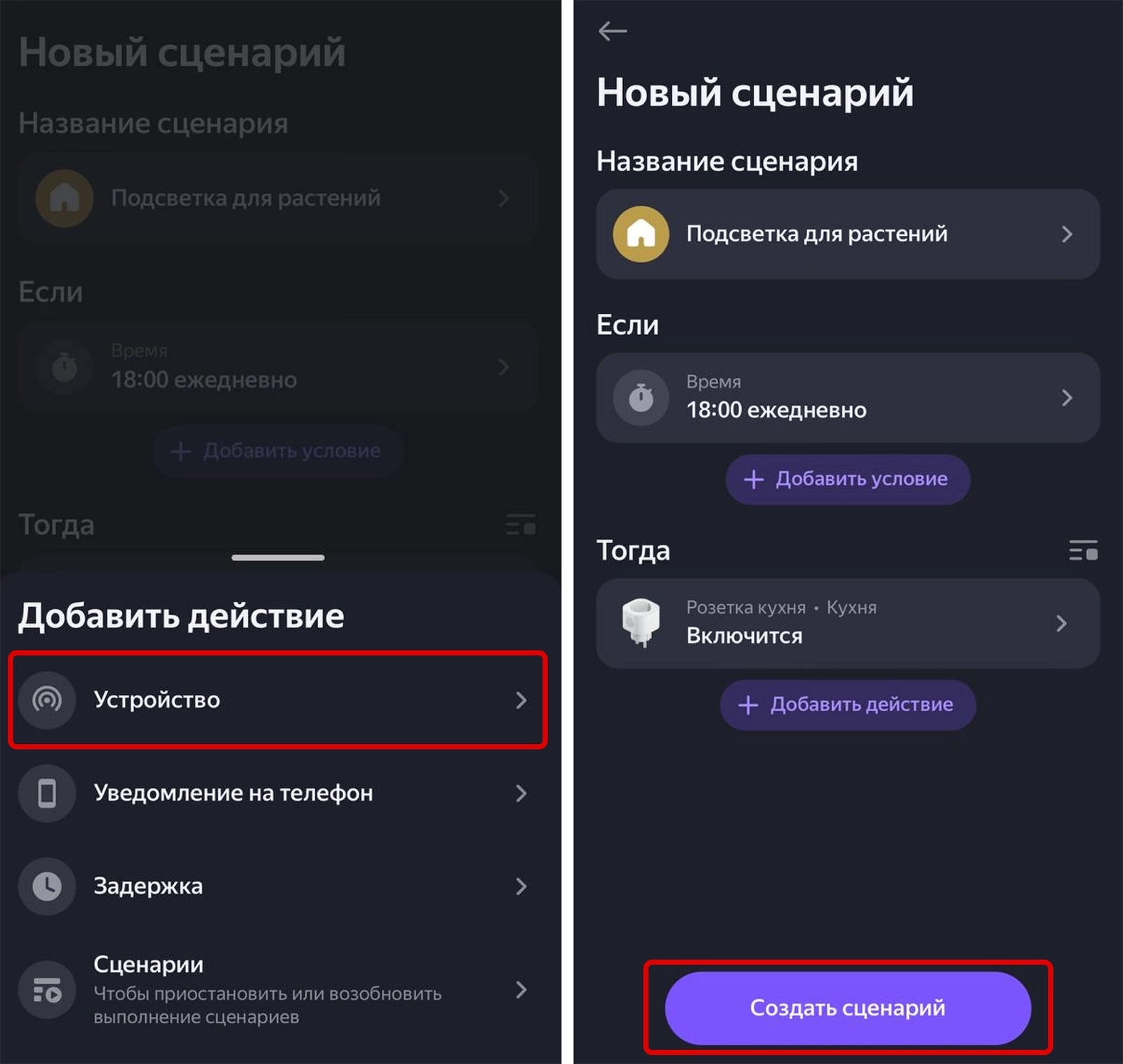 Добавьте источник освещения, который подключен к выключателю, и действие — включить или выключить свет. Нажмите «Создать сценарий». Теперь освещение растений будет работать по заданному расписанию.