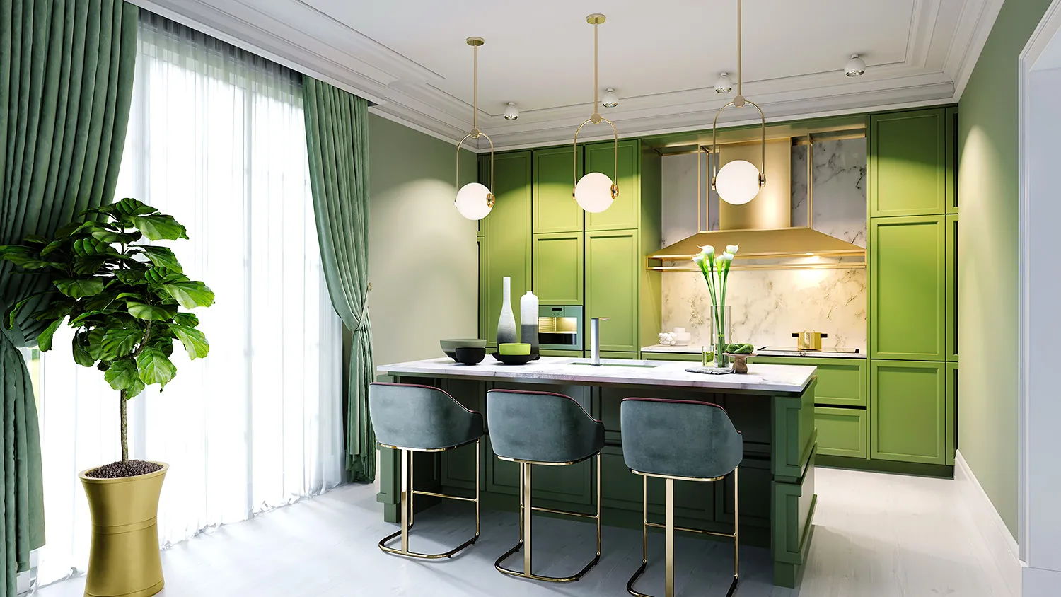 При естественном освещении оттенок фисташкового меняется в течение дня, придавая кухне живость и теплоту. Усилить эффект можно аксессуарами: посудой, занавесками или декоративными элементами в той же цветовой гамме.