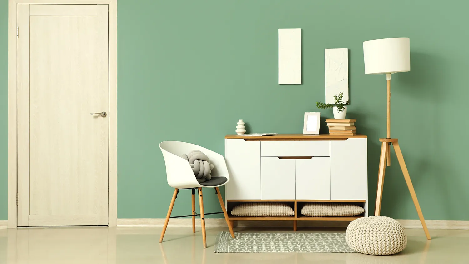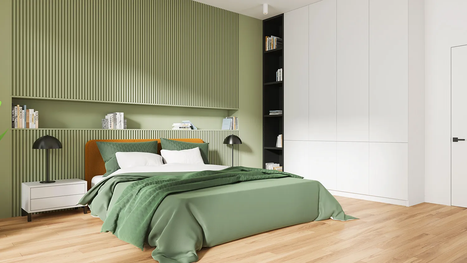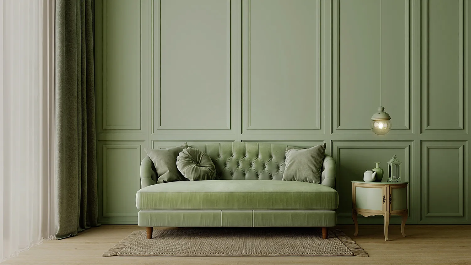 Здесь оттенки зеленого ореха создают свежую, умиротворяющую атмосферу, и их легко сочетать с разными элементами интерьера.