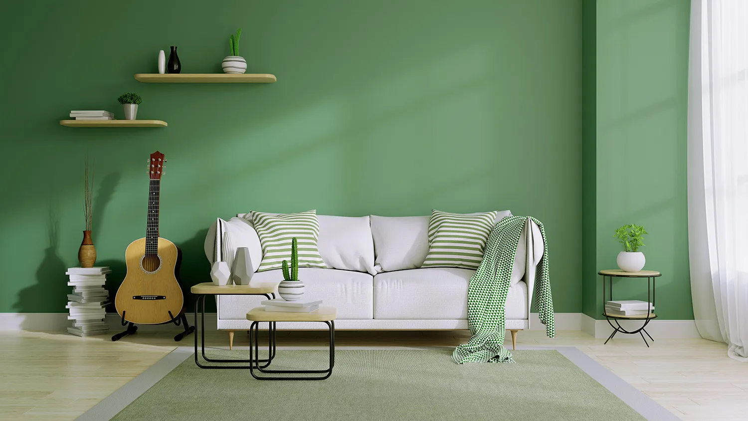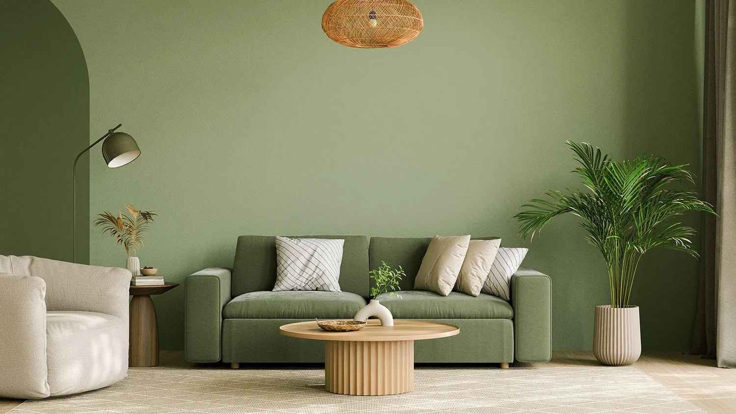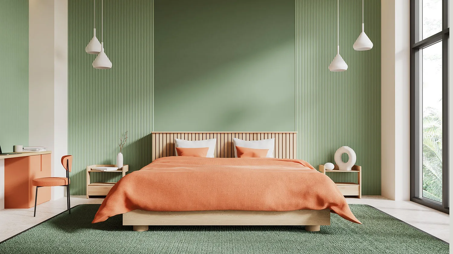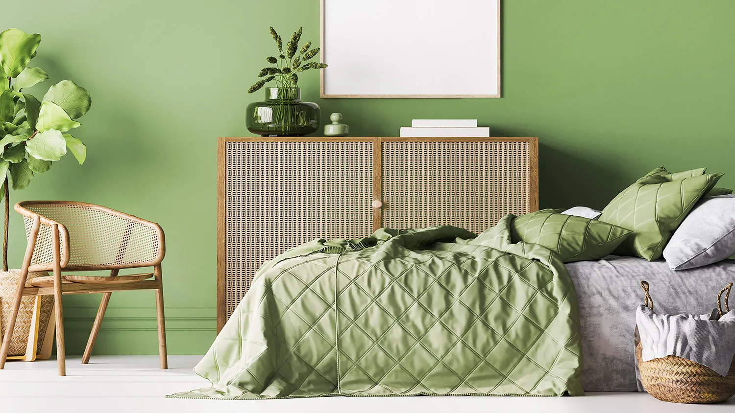 Здесь оттенки зеленого ореха создают свежую, умиротворяющую атмосферу, и их легко сочетать с разными элементами интерьера.