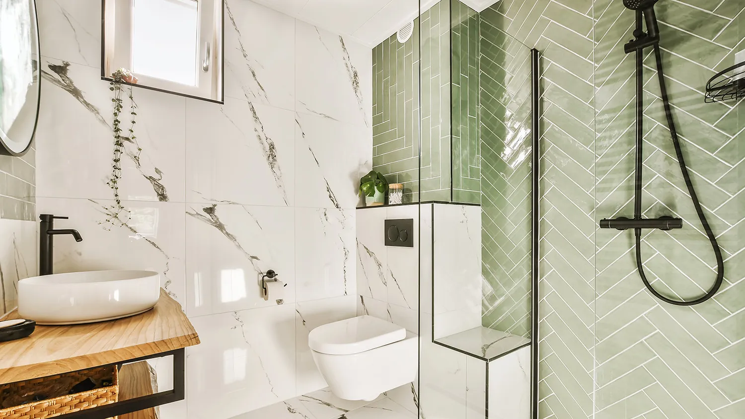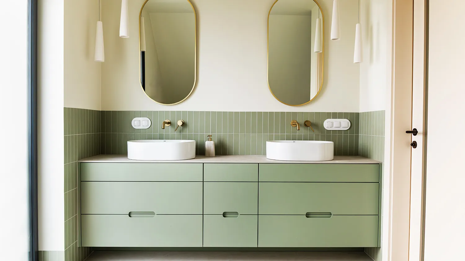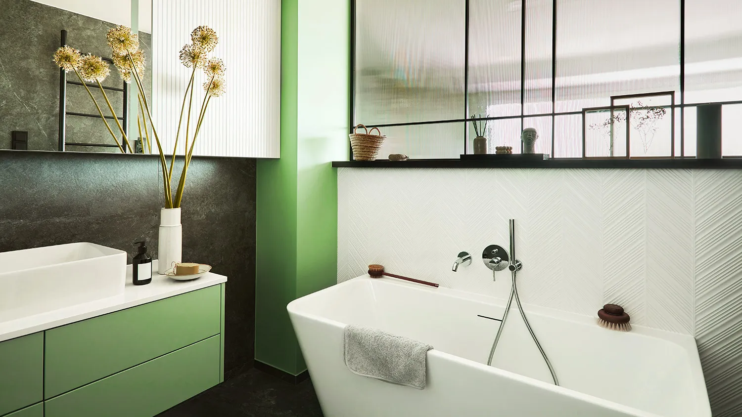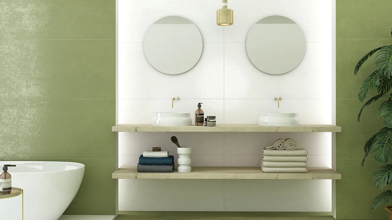 В небольших ванных лучше использовать светлые тона — они добавляют помещению объема и площади, а также мягко сочетаются с белой сантехникой. В просторных помещениях их можно комбинировать с более насыщенными зелеными оттенками или яркой плиткой-мозаикой.