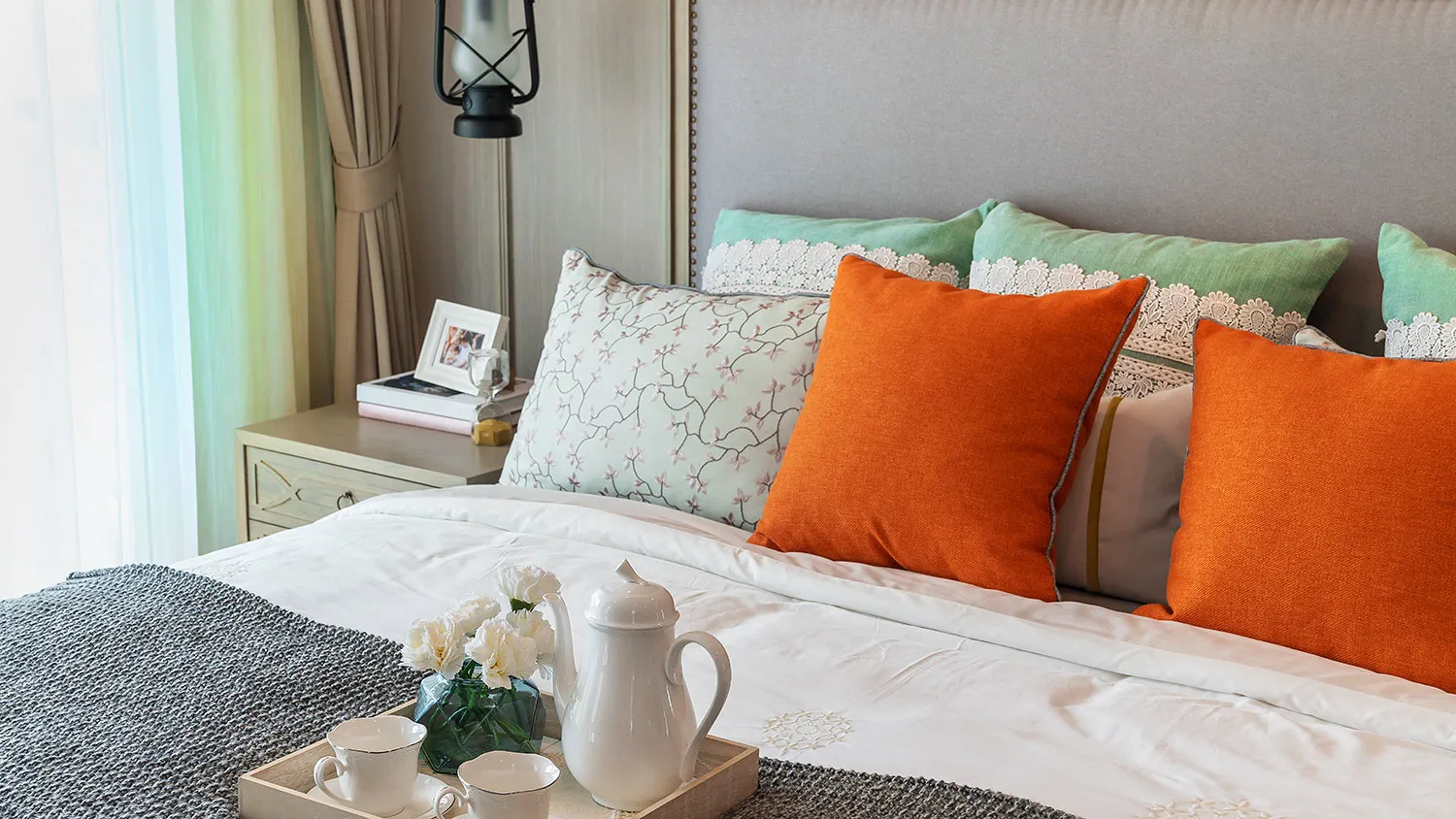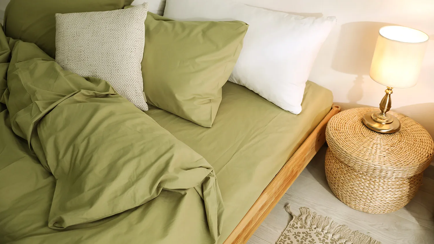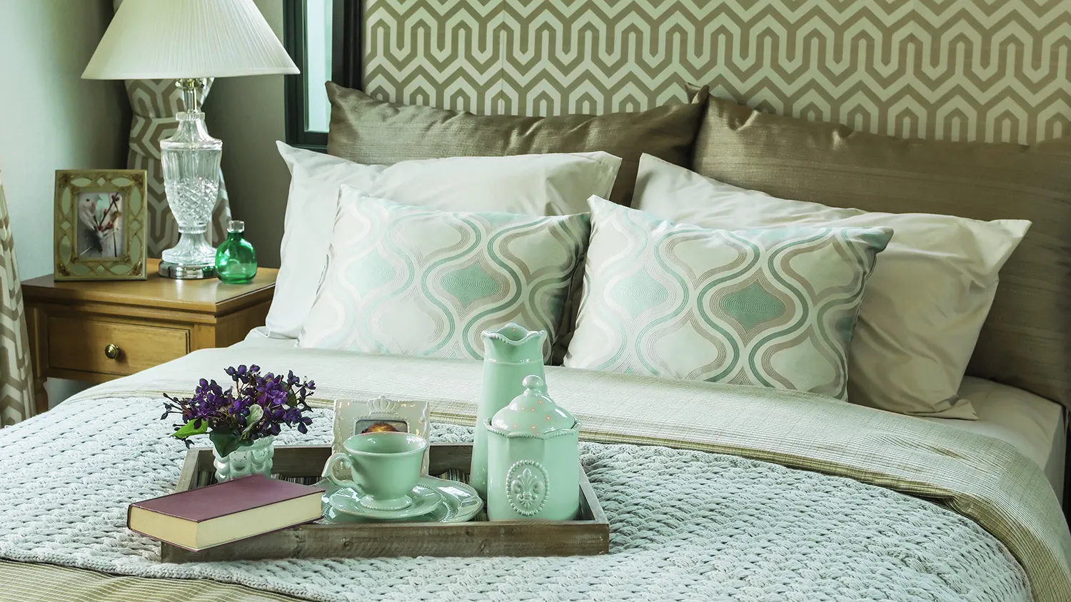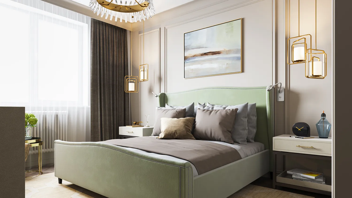 Сочетание фисташкового и мятного цветов в интерьере спальни. Источник: Pixel-Shot/shutterstock.com/FOTODOM, изображение модифицировано редакцией