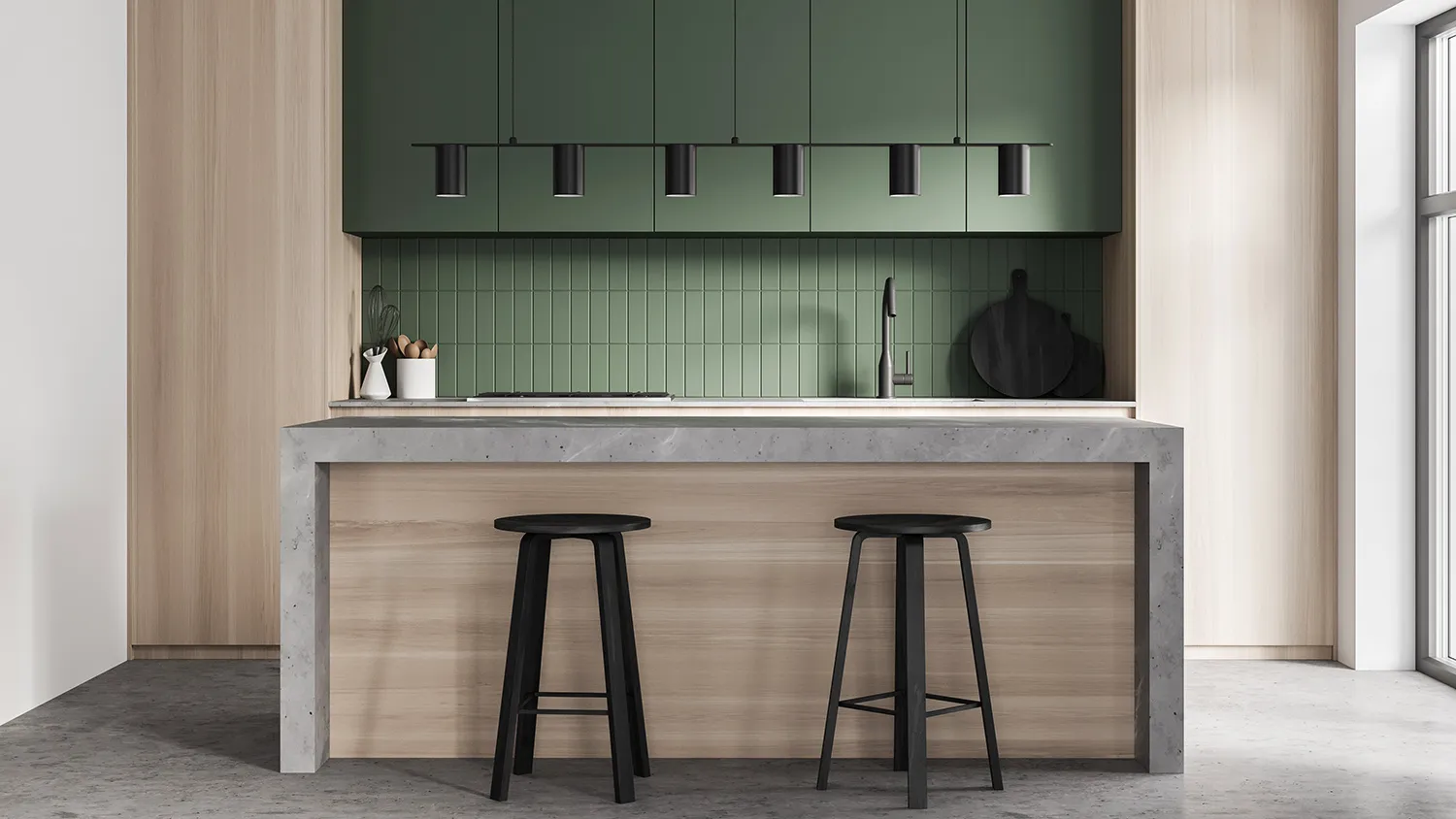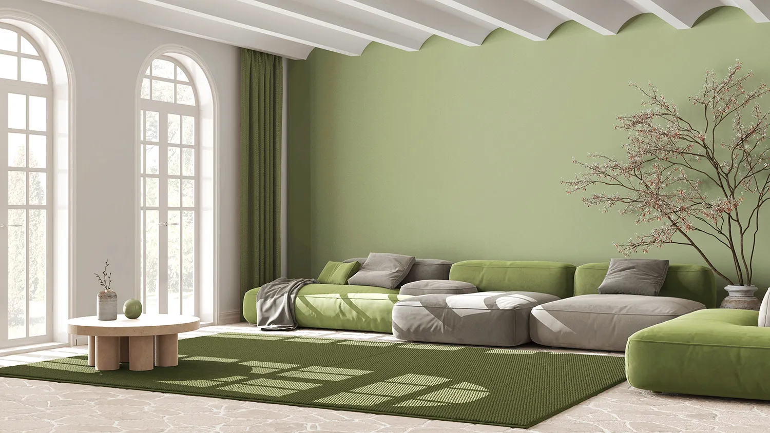 Яркий представитель группы ― оливково-фисташковый. Глубокий, плотный оттенок с теплым желтоватым отливом. Подходит для акцентных панелей, мебельных фасадов и зонирования просторных помещений. Цвет привносит в интерьер ощущение уверенности и связи с природой, способен задать настроение всей комнате. Он добавляет благородной строгости и уютной камерности, особенно если его используют в сочетании с натуральным деревом теплых пород.