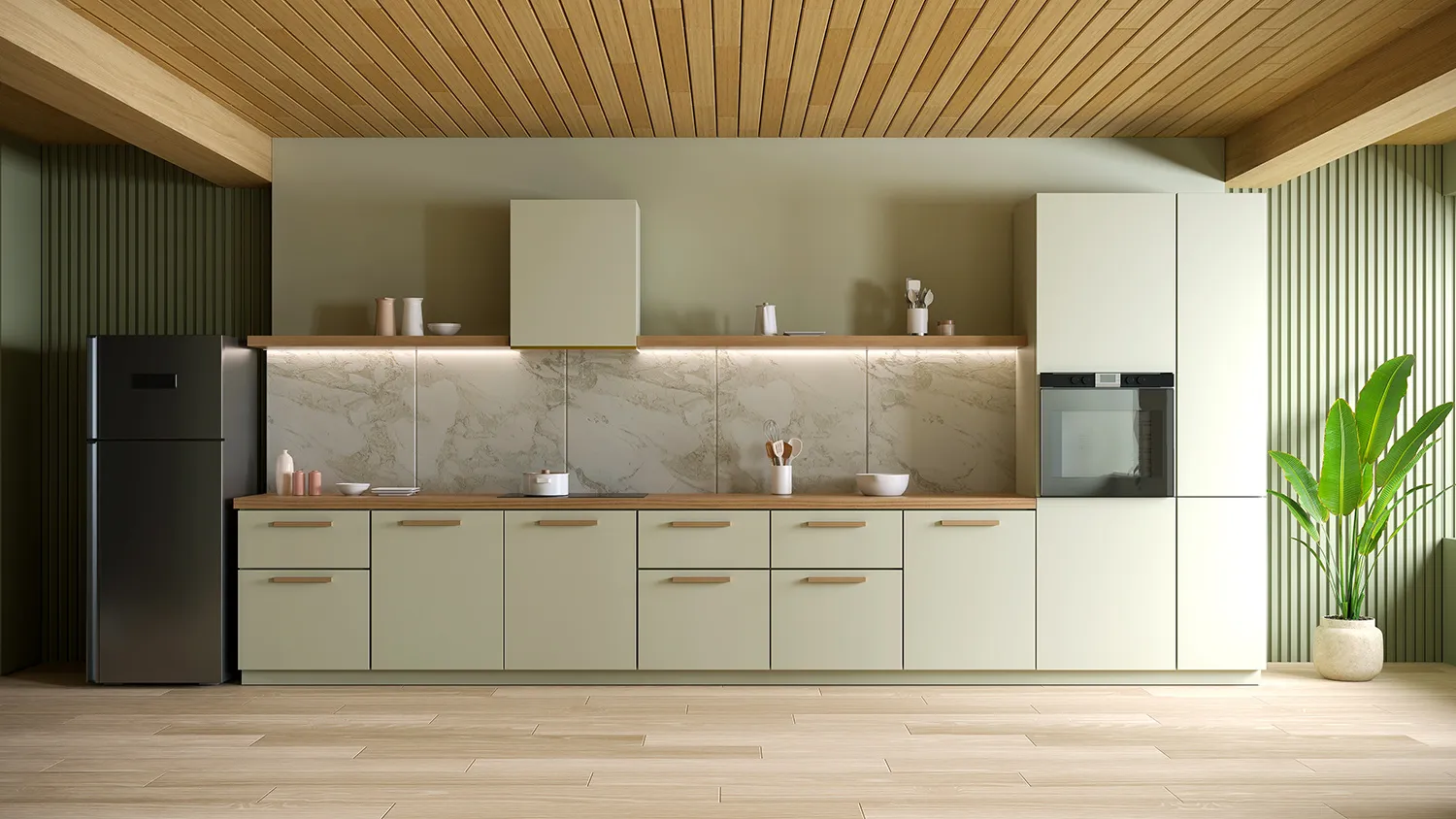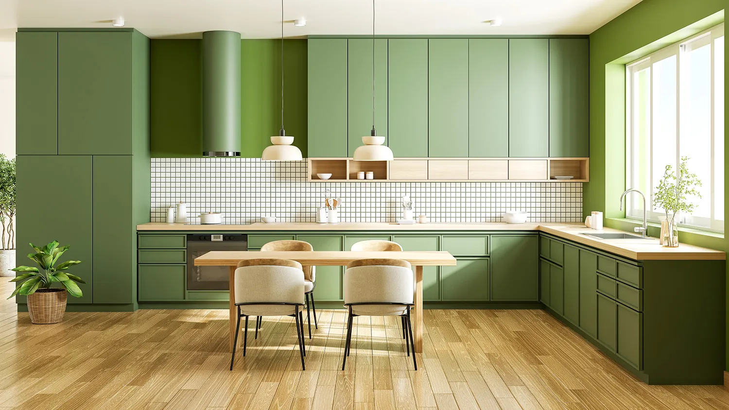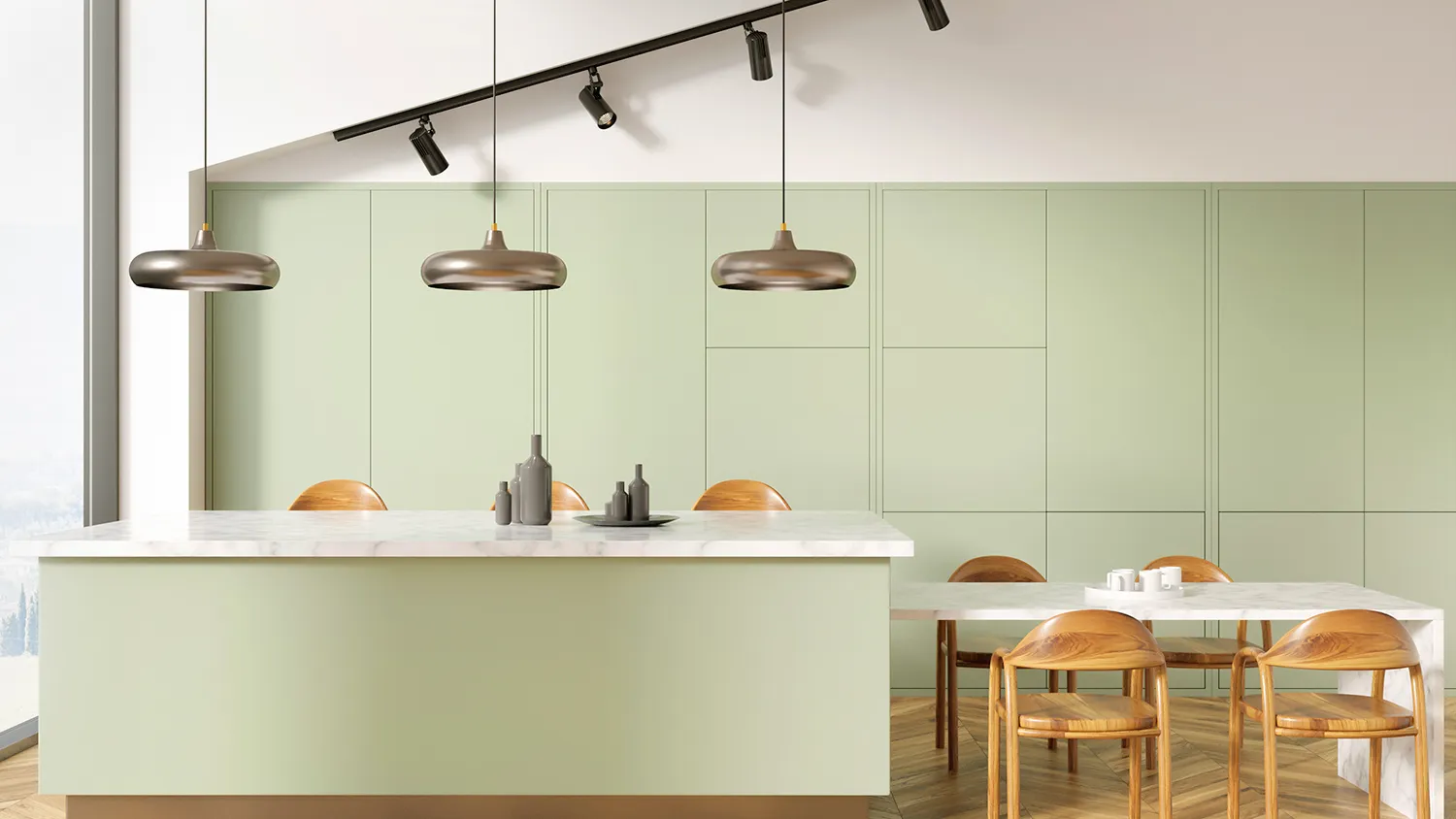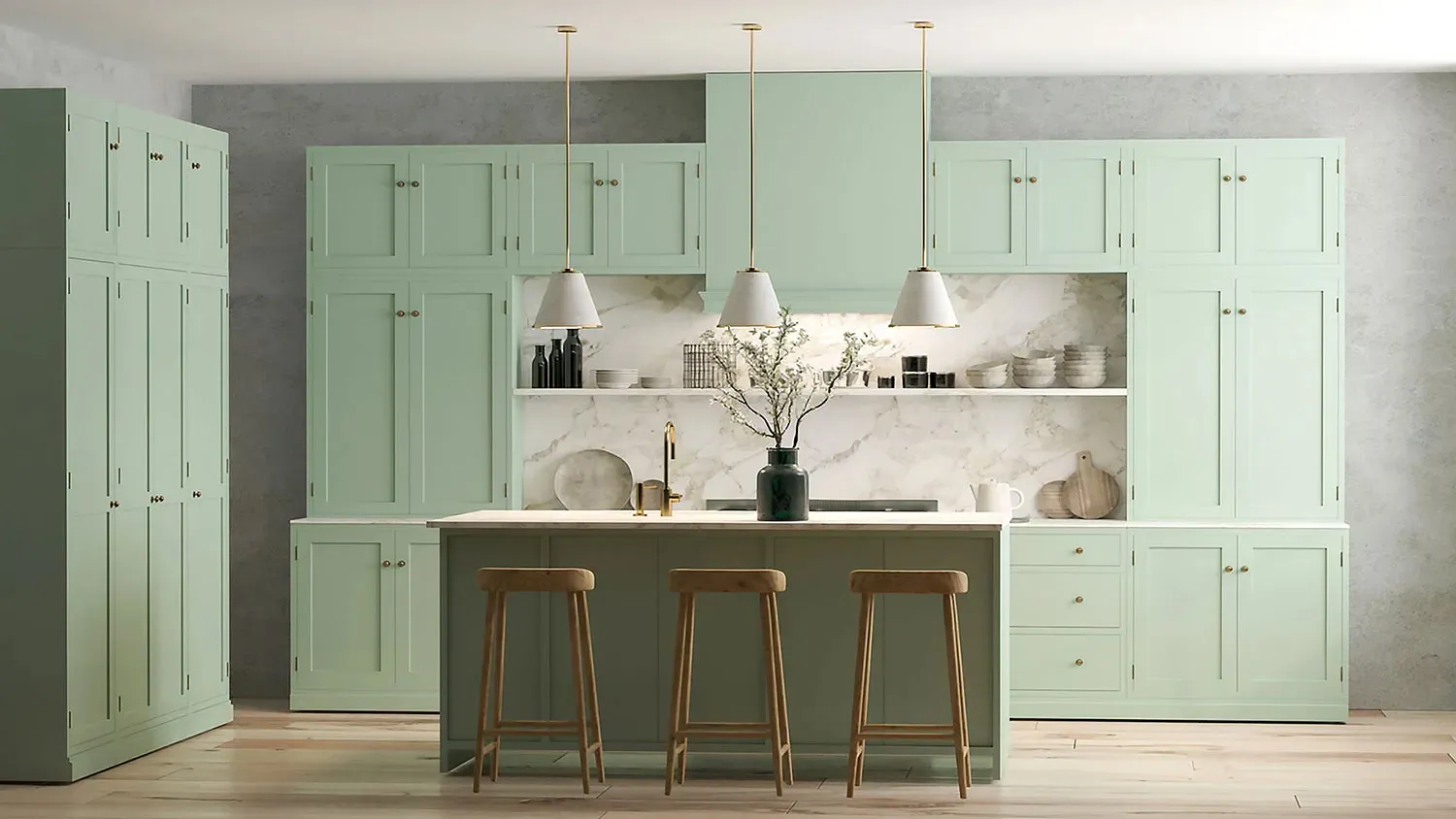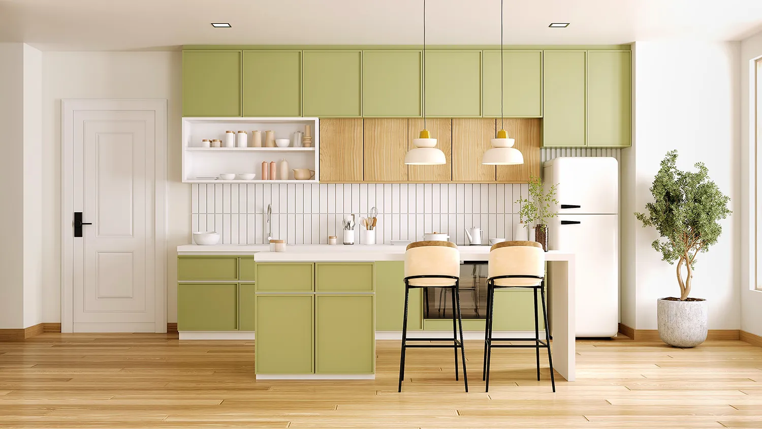 В компактных кухнях лучше использовать светло-фисташковый цвет: он визуально делает пространство шире, особенно в сочетании с нейтральным фартуком, светлой столешницей и открытыми полками.