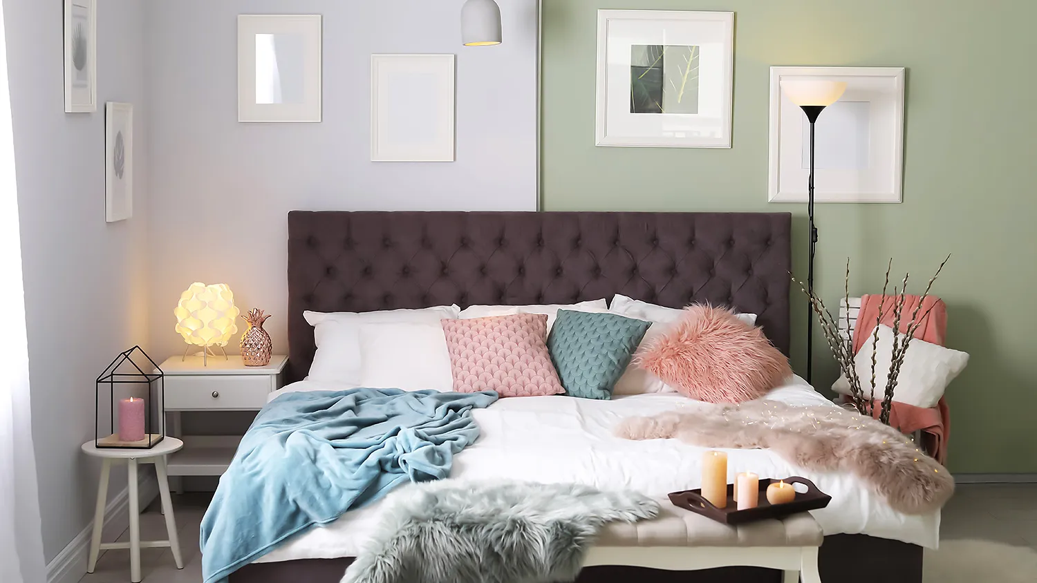 Сочетание фисташкового и лавандового цветов в интерьере спальни. Источник: Svet_Feo/shutterstock.com/FOTODOM, изображение модифицировано редакцией