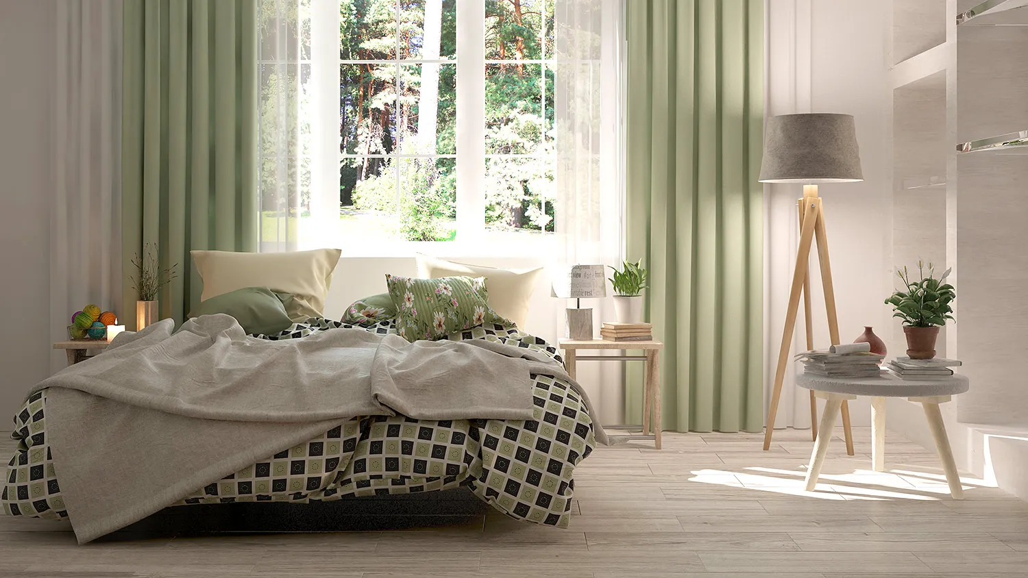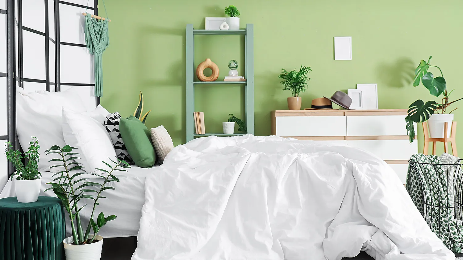 В комнате для отдыха цвет фисташки создает умиротворяющую атмосферу, способствует расслаблению и помогает настроиться на сон. Наиболее органично цвет вписывается в отделку стен и текстильный декор. Попробуйте выкрасить акцентную стену, дополнить интерьер постельным бельем на тон темнее или выбрать обитое тканью изголовье кровати.