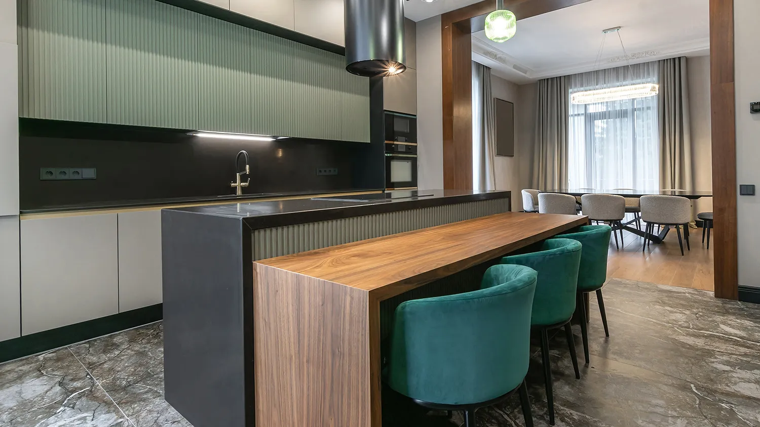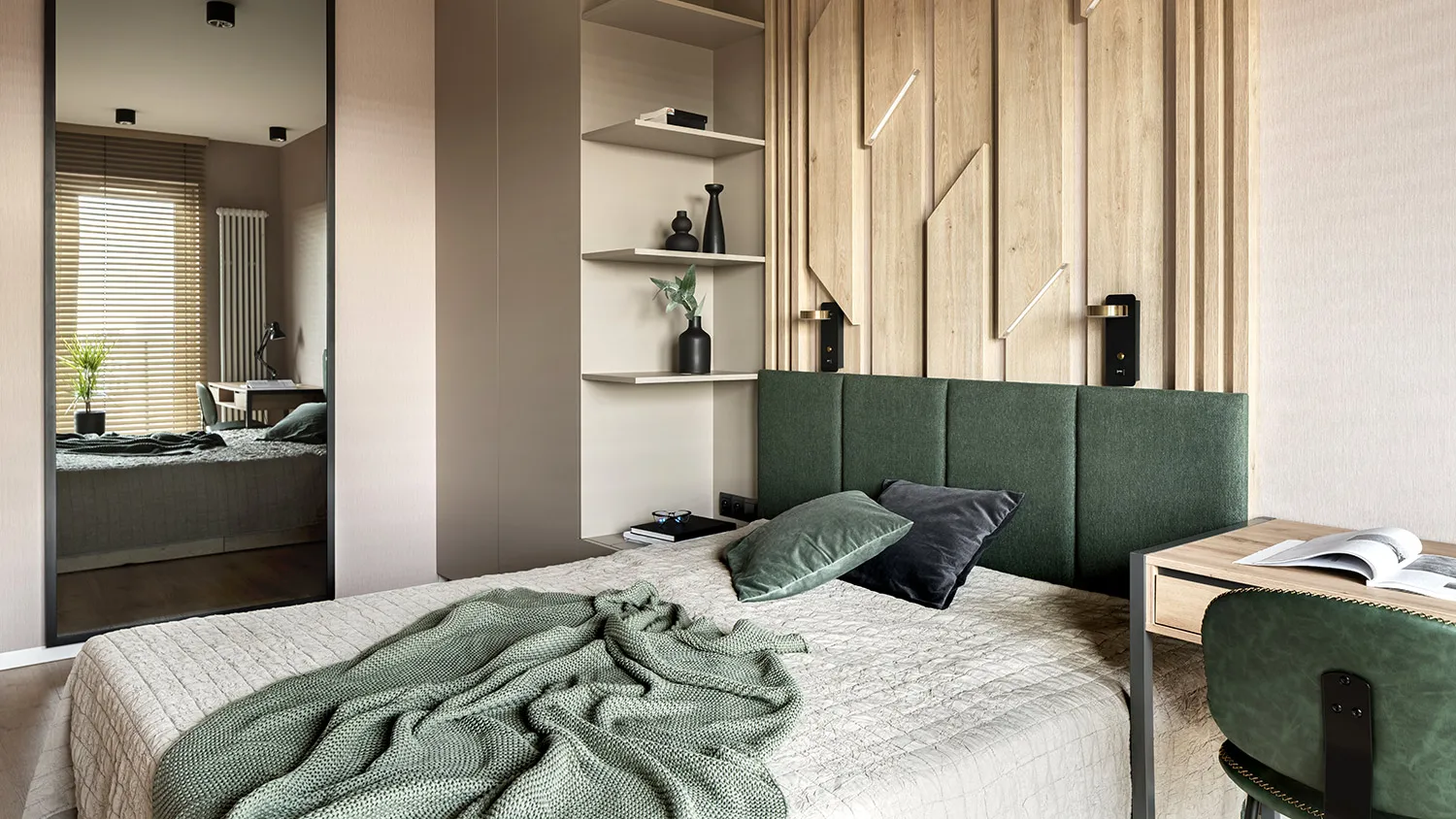 Цвет зеленого ореха органично вписывается в интерьерные стили, но в каждом раскрывается по‑разному. В зависимости от оттенков‑компаньонов и фактур он может выглядеть по‑домашнему уютно, элегантно или современно.