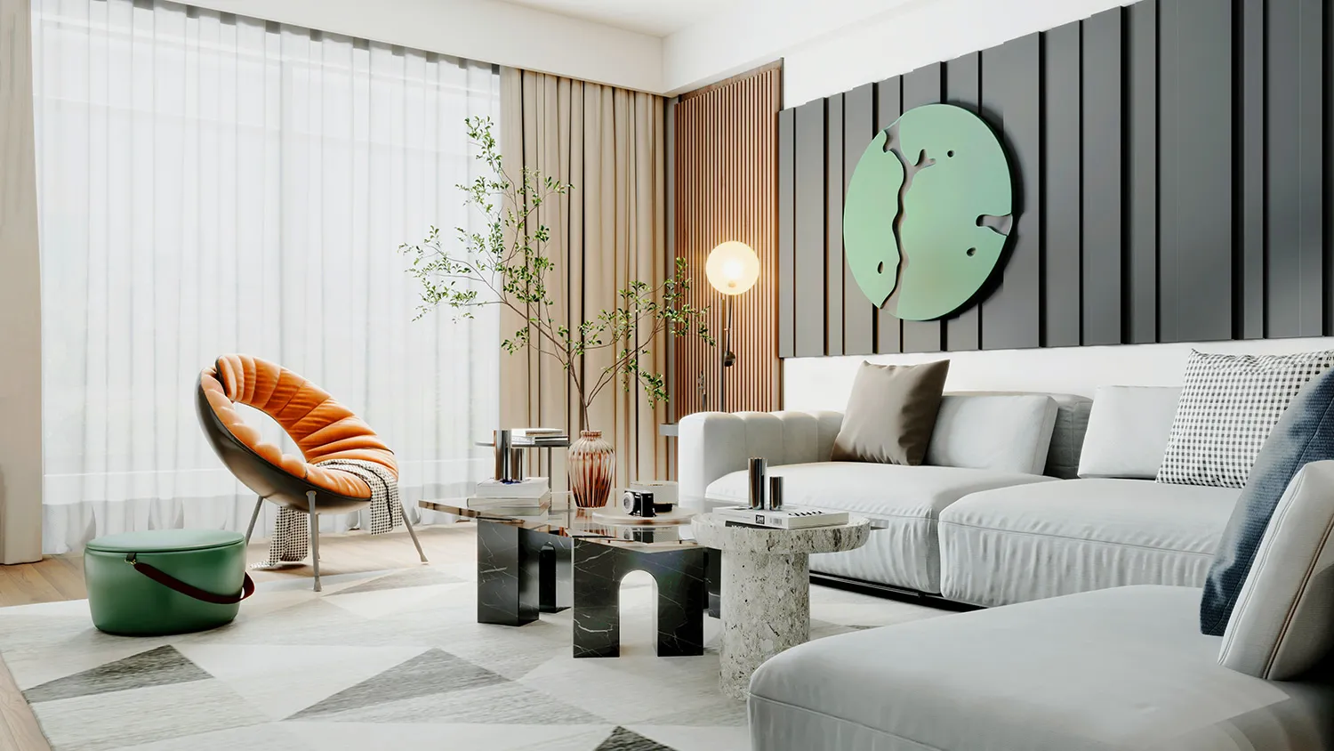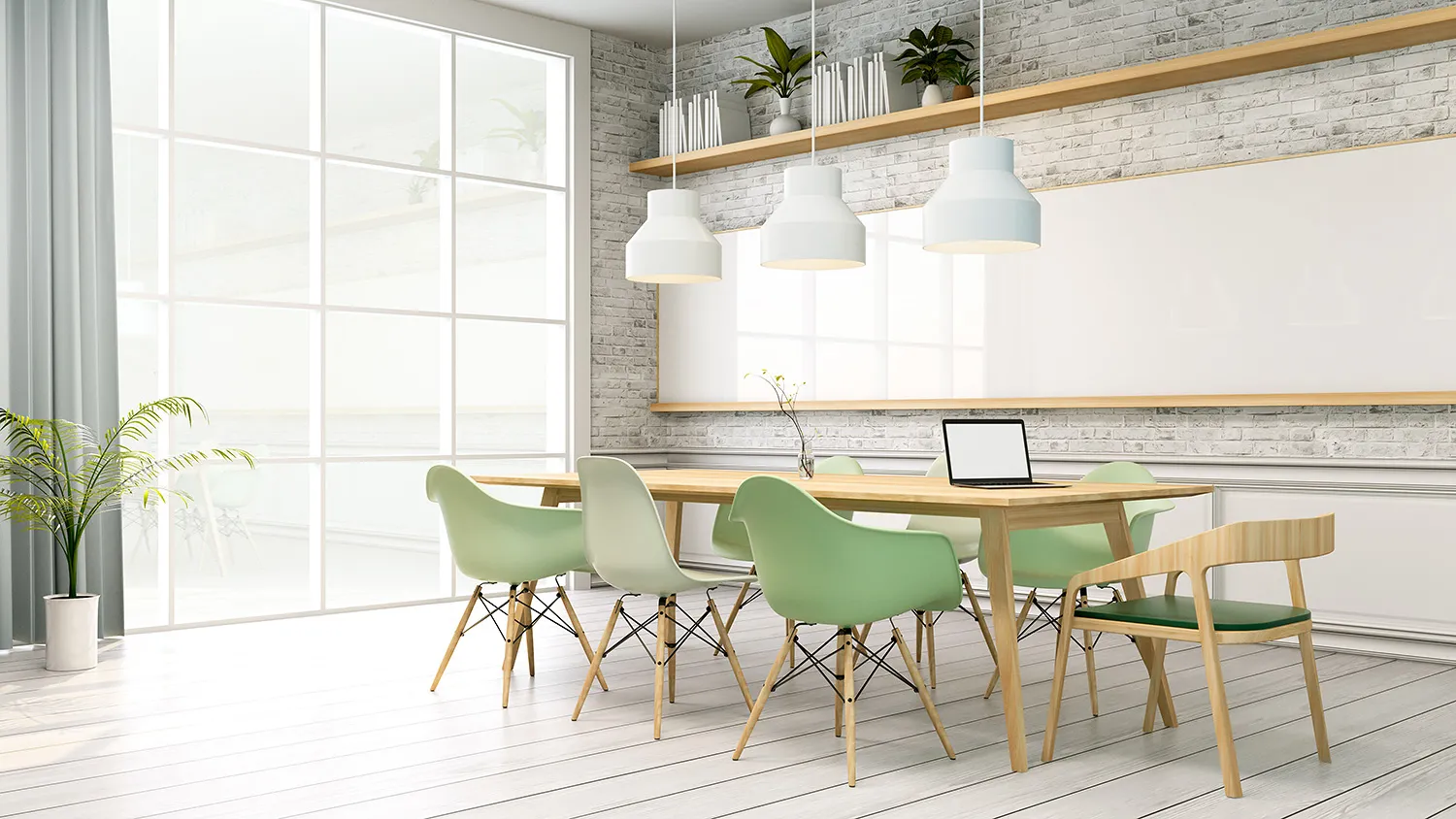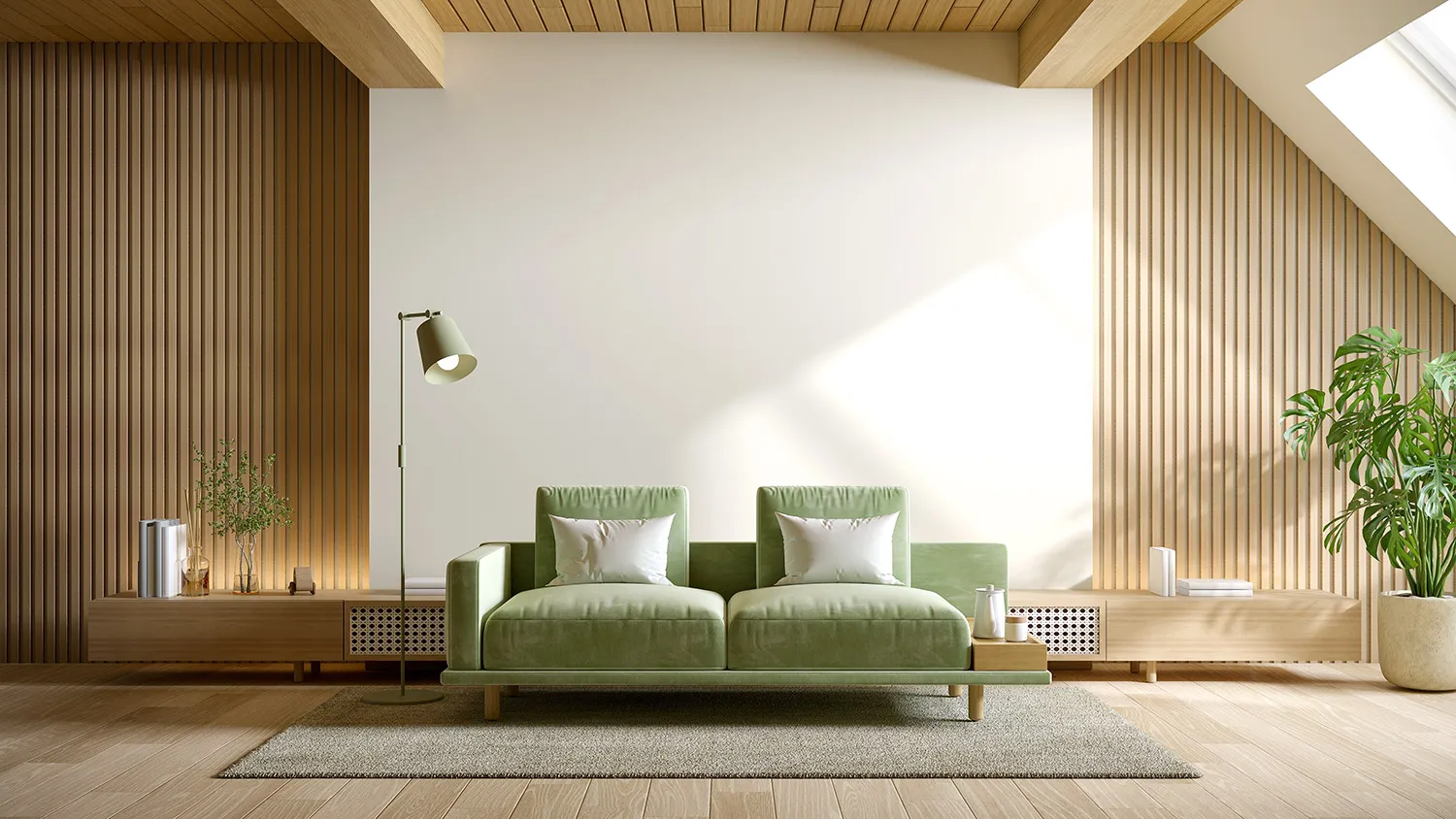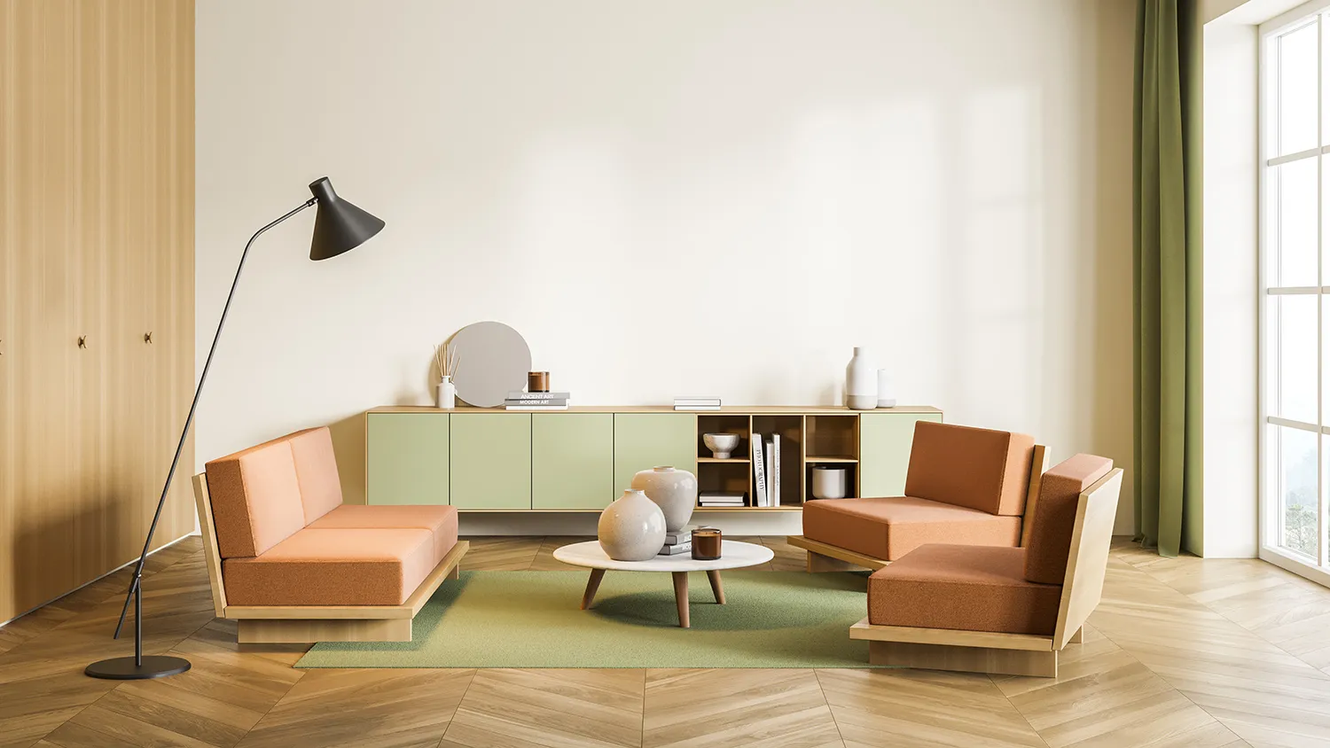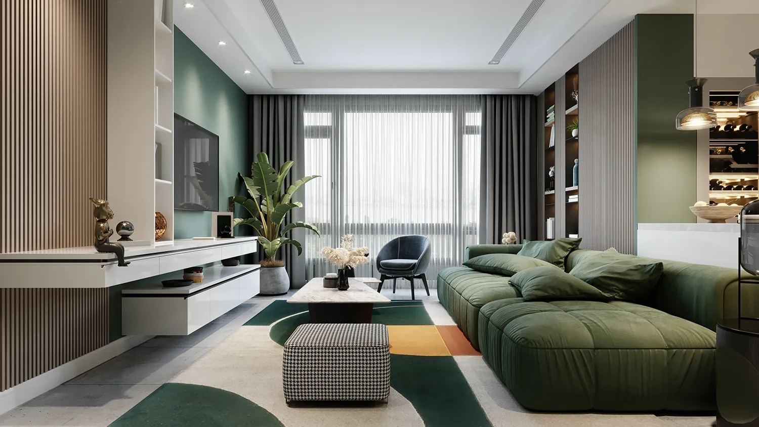 Этот современный стиль интерьера сочетает чистые линии, функциональность и нейтральную цветовую базу с акцентами на текстуры и натуральные материалы. Здесь фисташковый можно использовать в отделке стен, обивке мебели или крупных элементах текстиля. Важно выбирать чистые, ровные оттенки без избыточной яркости — они поддерживают упорядоченность и ясность композиции, характерные для контемпорари.