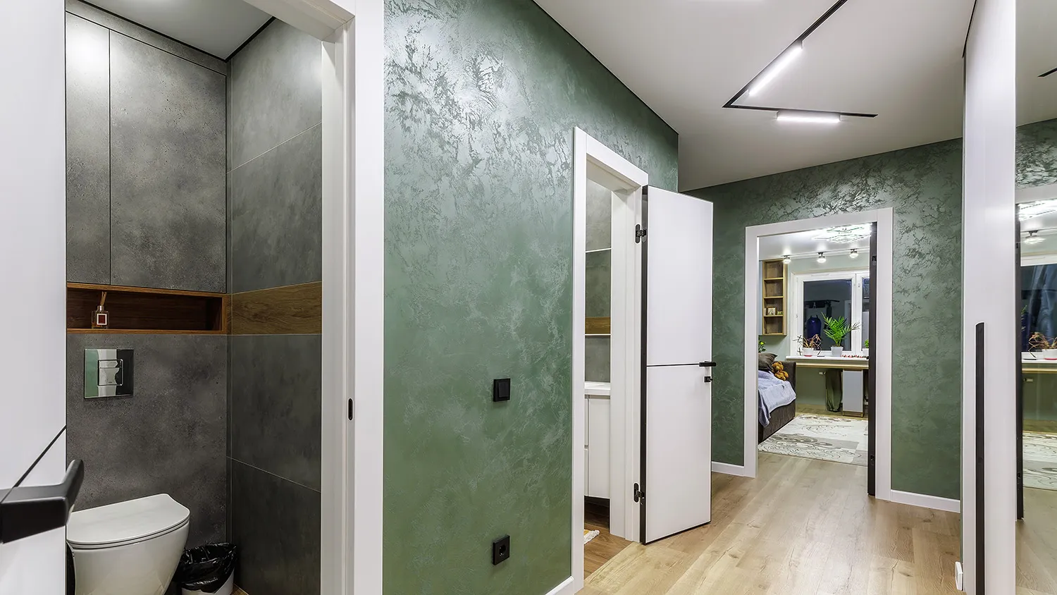 - Нейтральный свет (3300–5000 К) — усилит зеленый подтон, придаст свежесть и легкую «мятность». Хорош для рабочих зон, ванной, прихожей.
