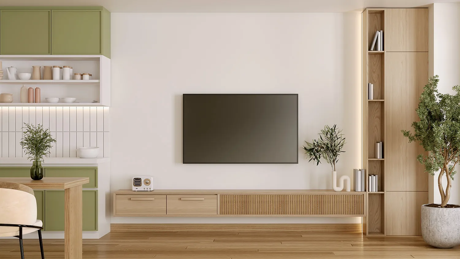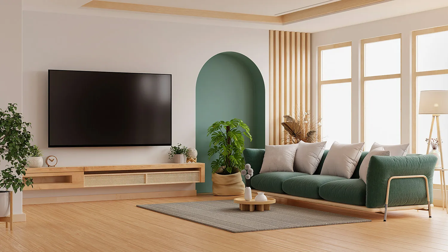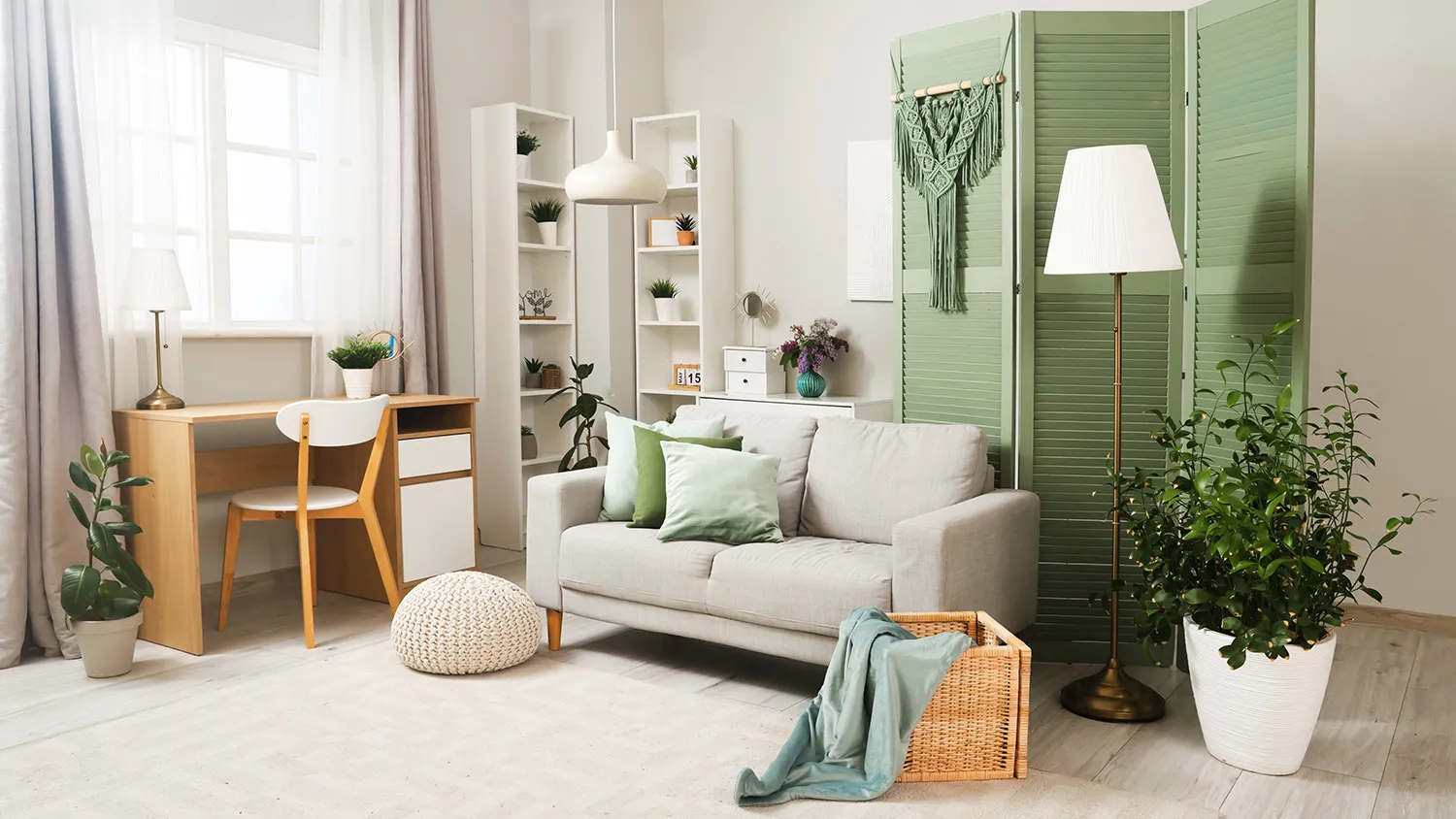 Чаще всего гостиные оформляют в спокойных тонах. Но если хочется яркости, можно точечно добавить оранжевых, желтых или бирюзовых красок. Продумайте детали, добавьте природные элементы: деревянные полки, журнальный столик, плетеные кашпо с растениями. Пледы, подушки и картины с природными мотивами усилят ощущение уюта. Освещение лучше сделать теплым (2700–3000 К) — так фисташковый заиграет мягче и теплее.