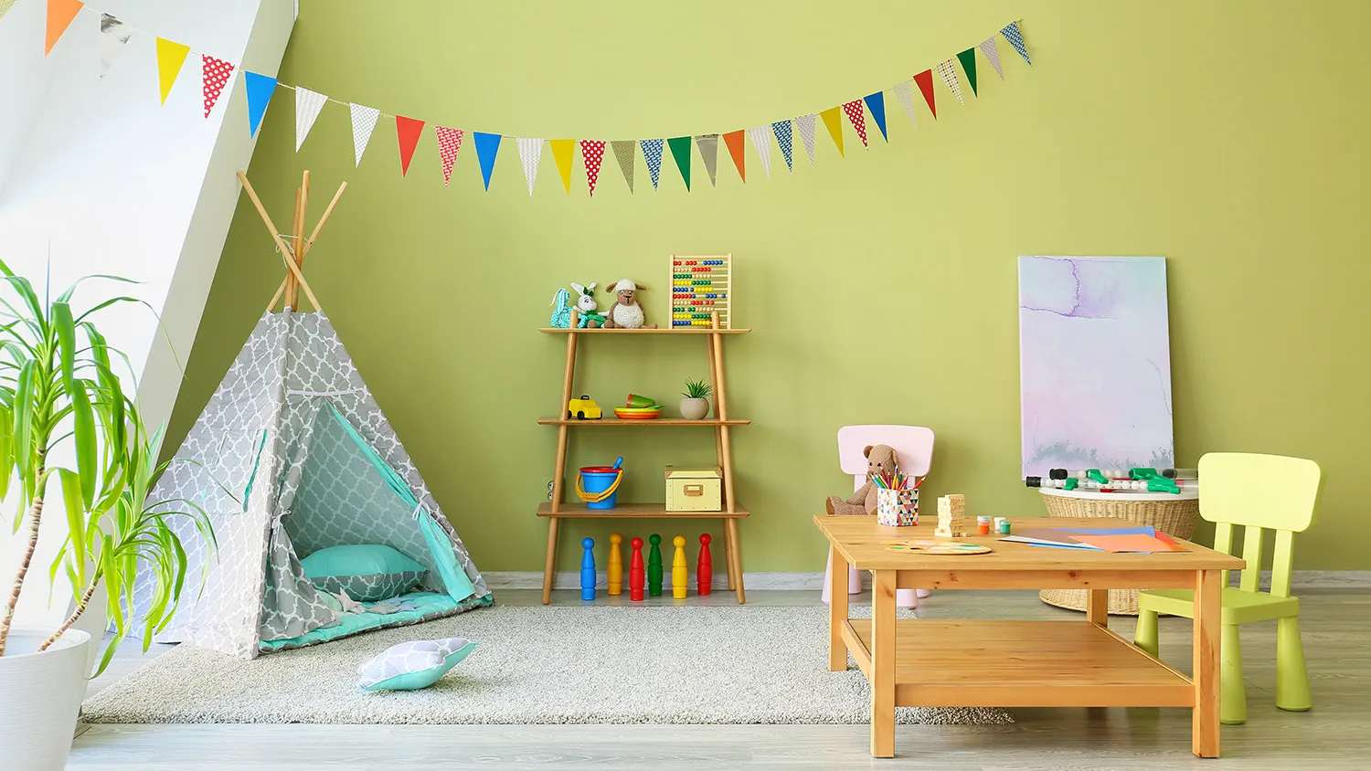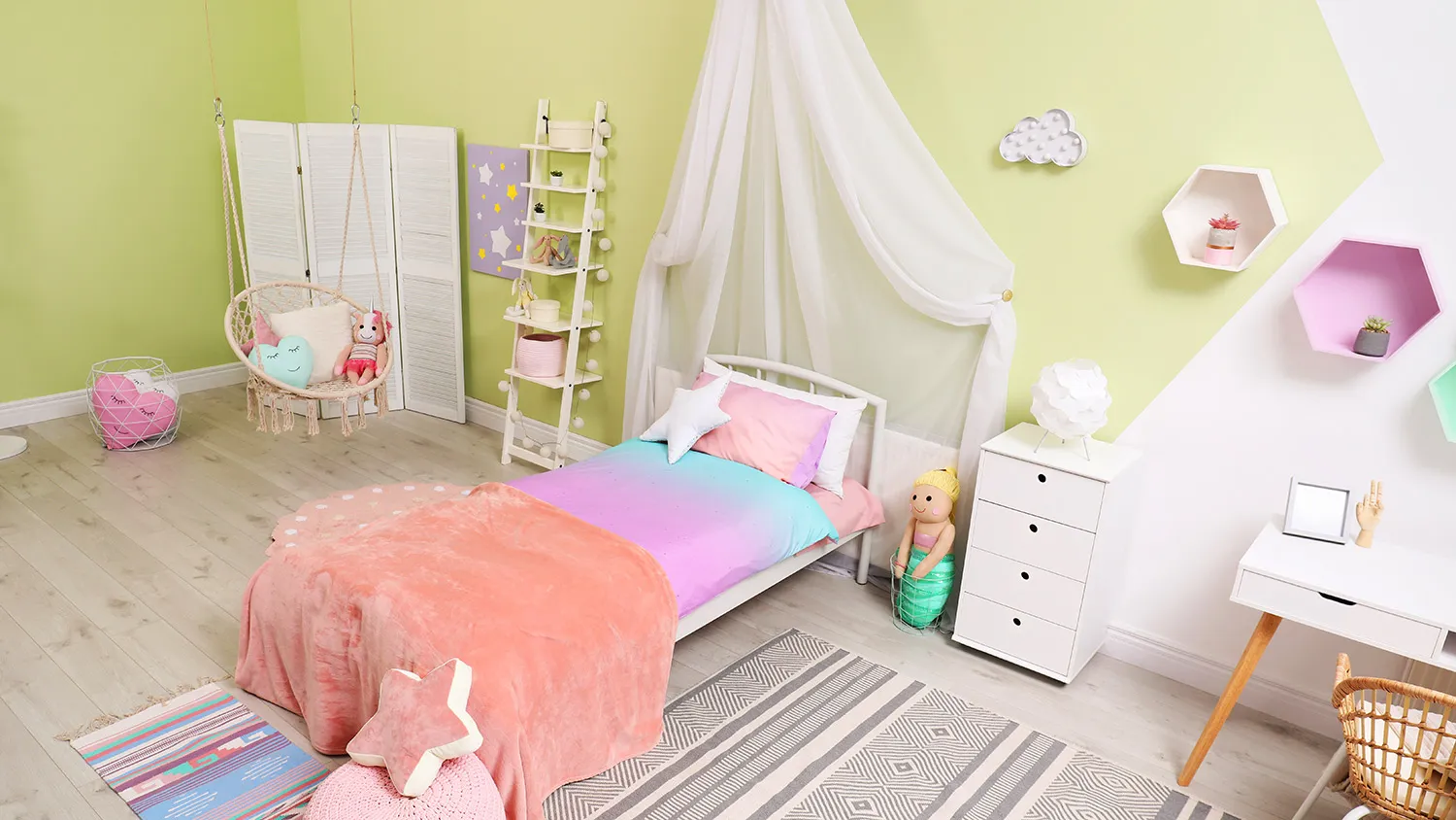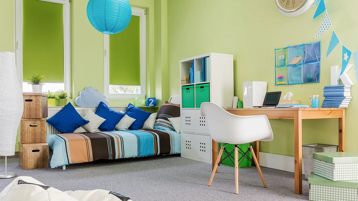Благодаря своей природной палитре фисташковый способствует спокойствию, развивает воображение и помогает ребенку концентрироваться, а с помощью ярких дополнений можно создать как энергичное пространство для мальчиков, так и сказочную атмосферу для девочек.