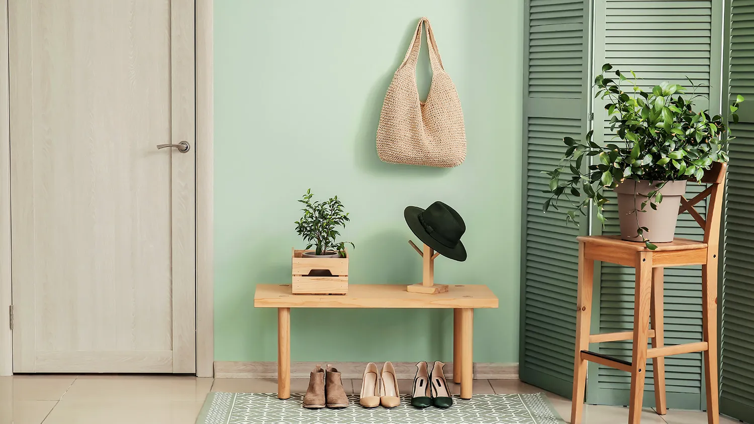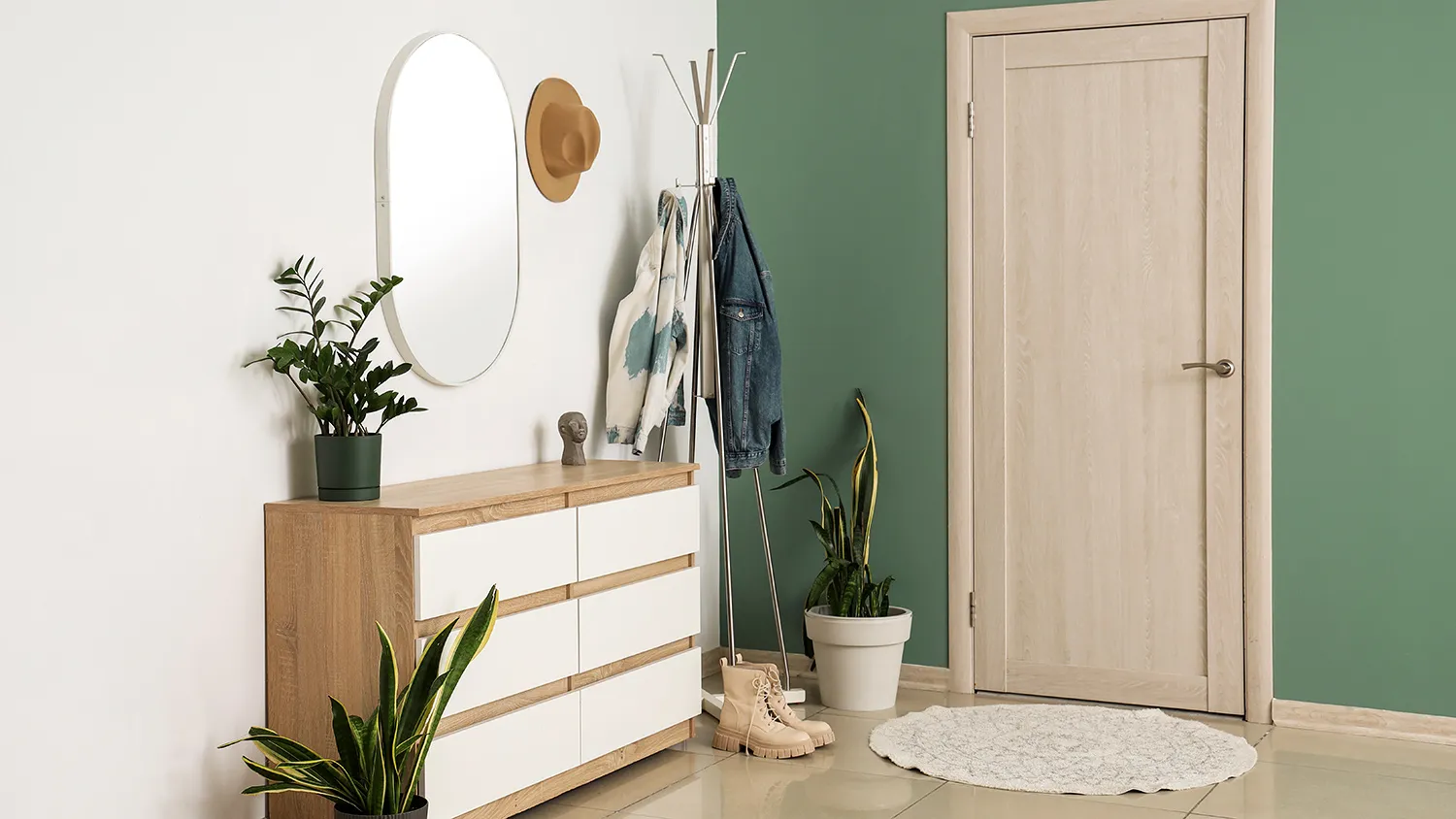 Для отделки прихожей подойдут декоративная штукатурка или обои — однотонные либо с ненавязчивым принтом. Фисташковый может быть не только основой, но и акцентом, например, если окрасить им фасады встроенного шкафа. В небольшой прихожей лучше сочетать светло‐фисташковые тона с белым, бежевым, голубым или персиковым — так помещение будет выглядеть просторнее.