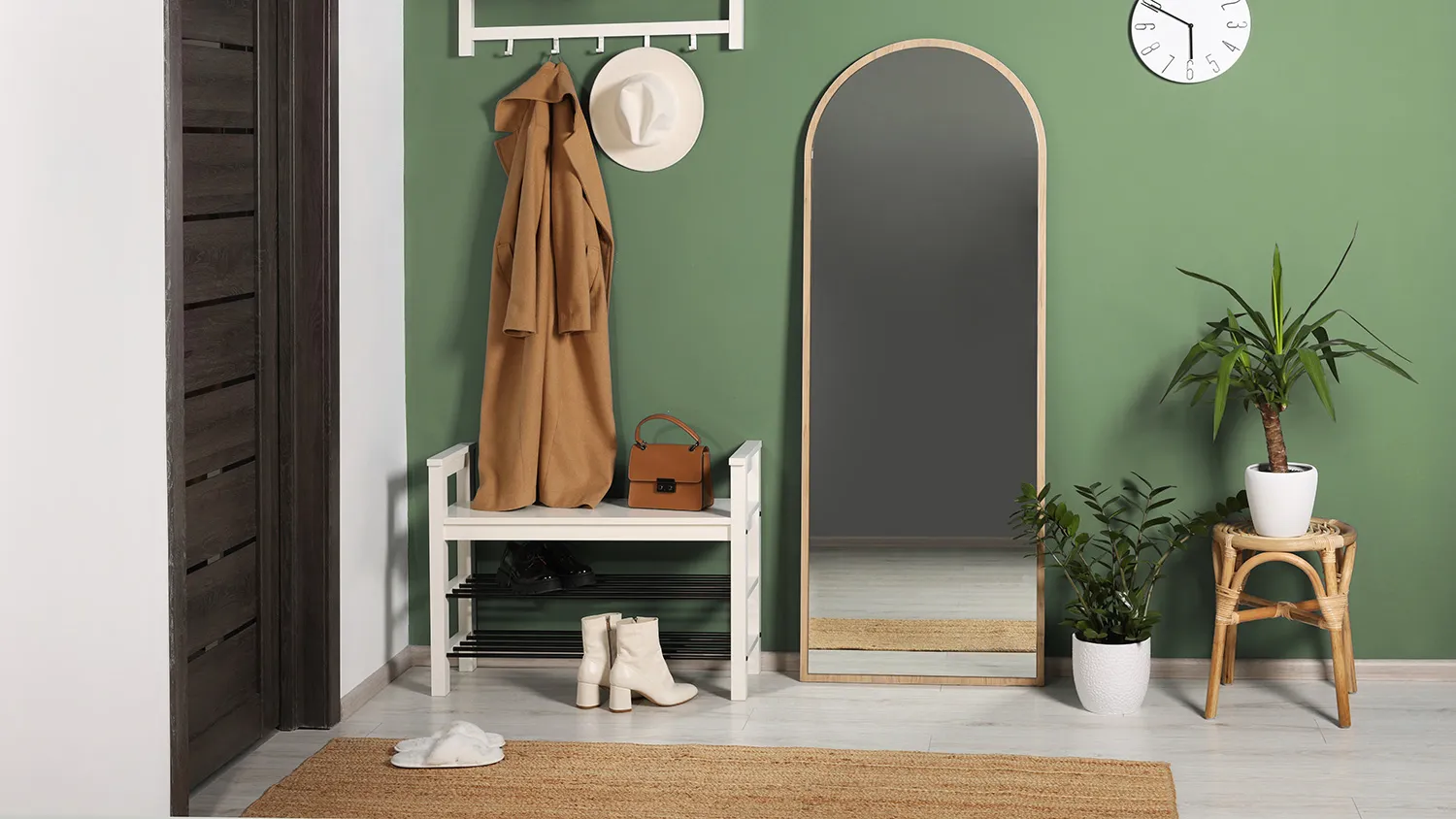 Чтобы коридор не казался скучным, добавьте контрастные детали: деревянные вешалки и крючки, корзины для хранения мелочей, зеркало в фактурной раме, пуф или яркий коврик у двери. В просторной прихожей можно позволить смелые сочетания с фиолетовым, бордовым, изумрудным, а также металлические или черные элементы декора.