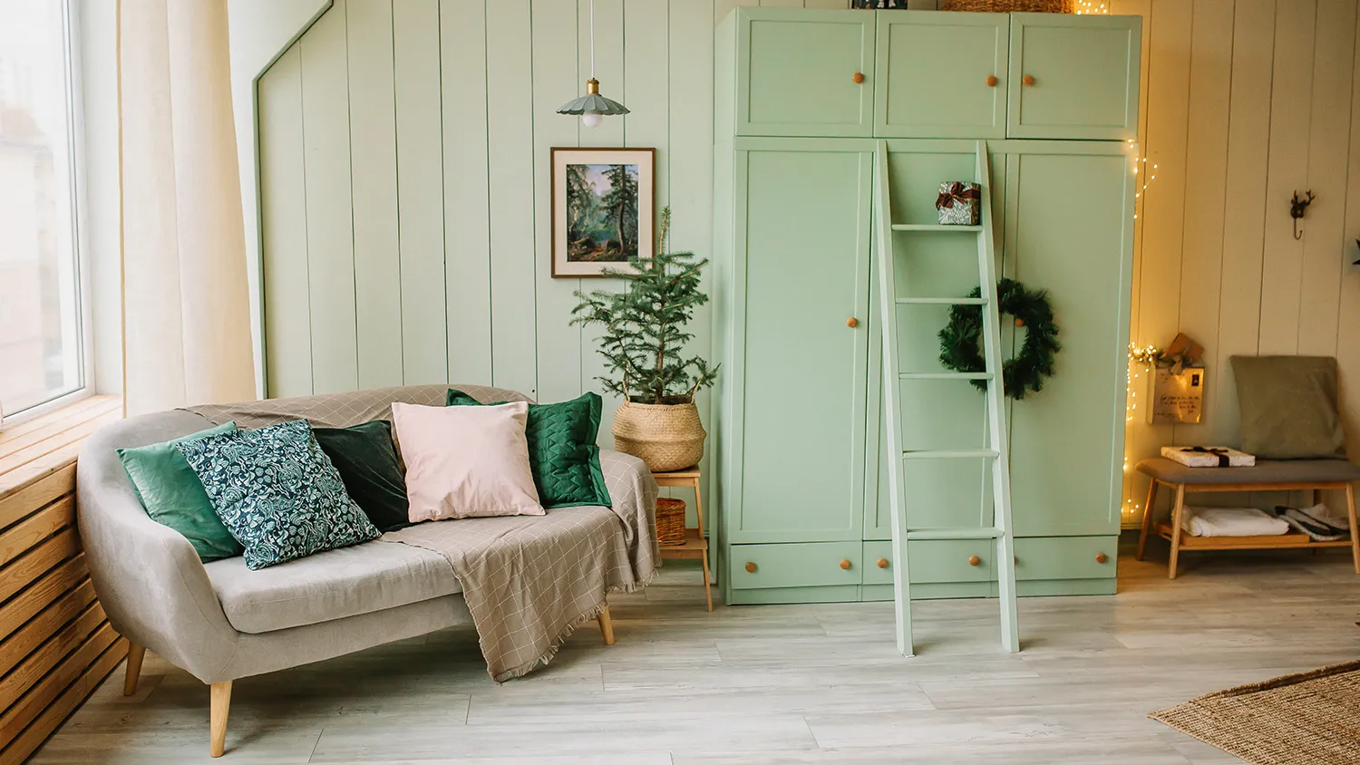 Мятно-фисташковый, в основе которого лежит сине-голубой подтон, ― свежий и холодный оттенок. Ассоциируется с утренней прохладой и чистотой, создает ощущение стерильности, но без больничной холодности. Визуально раздвигает стены и приподнимает потолок, поэтому даже крошечная комната кажется наполненной воздухом и светом.