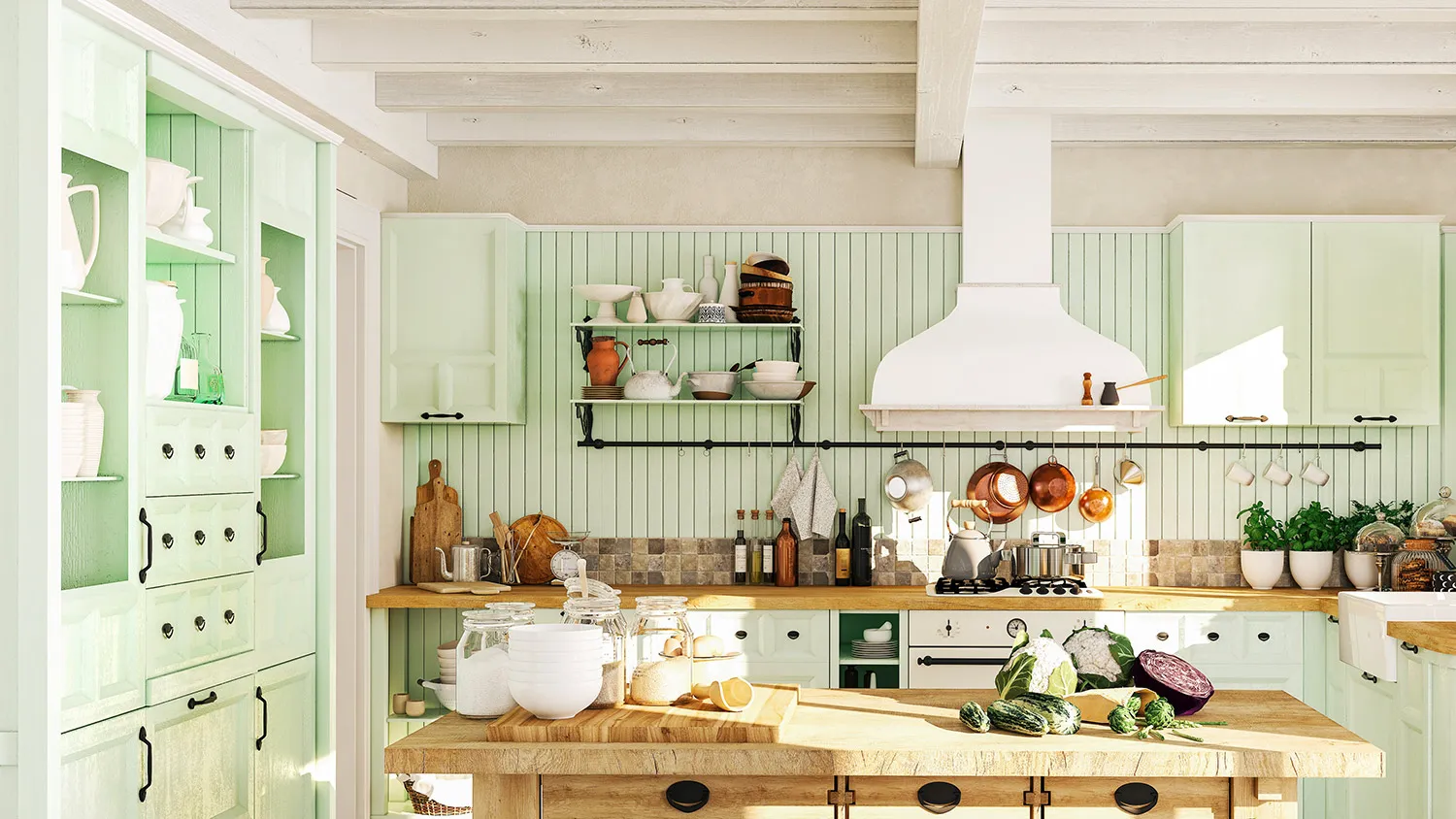 Главная черта прованса — мягкая, «выцветшая» пастельная гамма с ноткой провинциальности. Нежные светло‑зеленые оттенки фисташки с легким желтым подтоном создают ощущение свежести и простора. В провансе их часто используют для стен, мебели или текстиля.