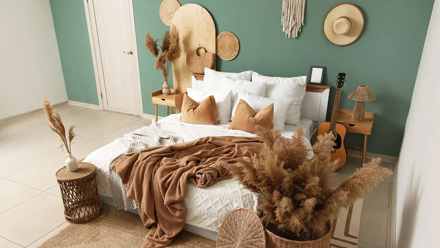 Свобода самовыражения, эклектика и природная теплота — характерные черты стиля бохо. В таком пространстве фисташковый цвет выступает как мягкий, но выразительный фон. Например, в отделке стен, обивке дивана или крупных текстильных элементах: коврах, пледах, занавесках. Его приглушенные зеленые оттенки гармонично сочетаются с характерными для бохо материалами: льняными и хлопковыми тканями, плетеными деталями из ротанга или джута, деревянными предметами с натуральной фактурой.