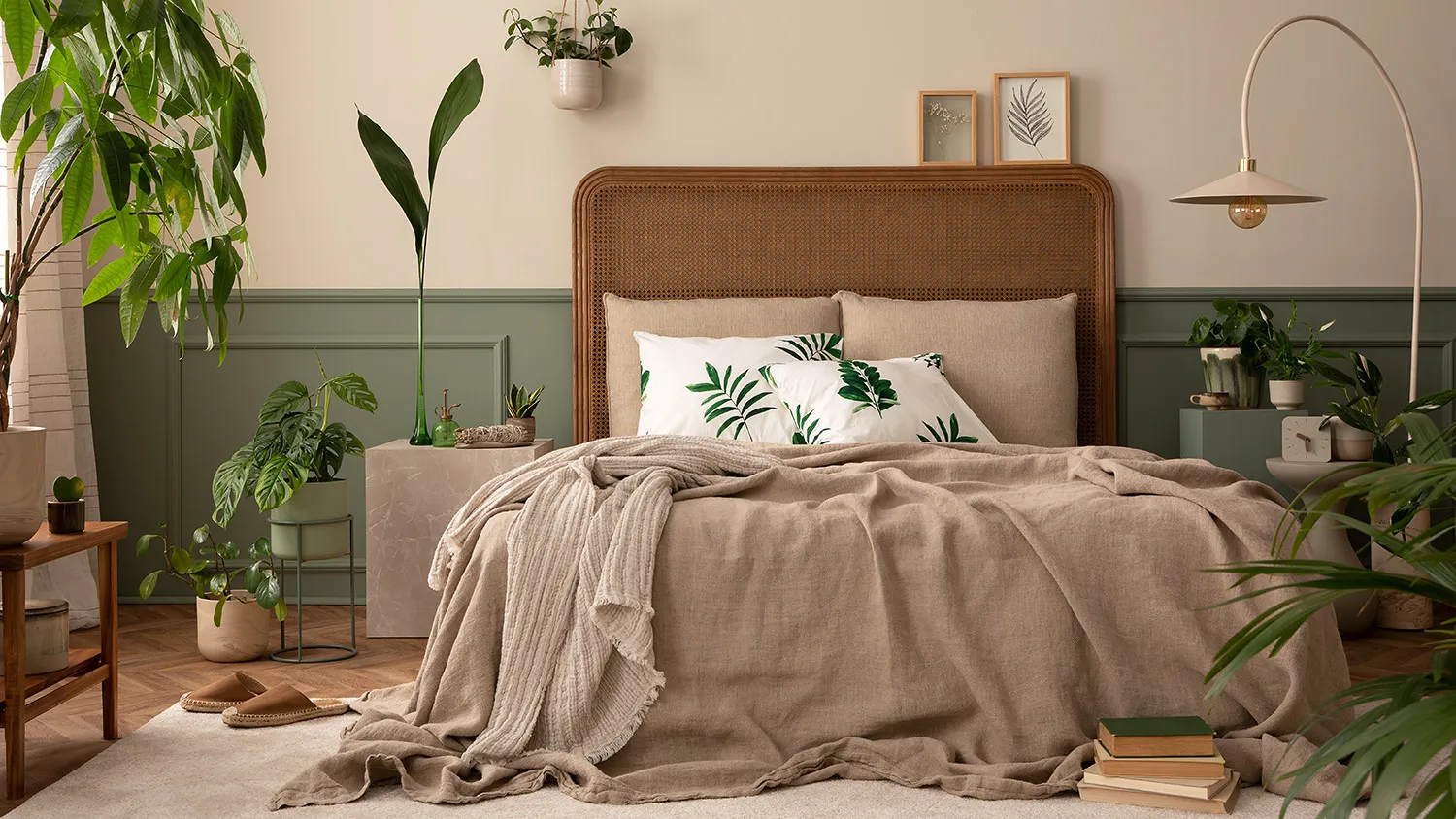 Чтобы спальня стала по‑настоящему уютной, не перегружайте пространство яркими деталями. Лучше сделать упор на живые растения, картины, семейные фотографии в деревянных рамках и мягкие ковры — это создаст ощущение домашнего тепла. Усилить эффект можно фактурными контрастами — хорошо смотрятся сливочно-зеленые пледы крупной вязки. Они одновременно несут функциональную и декоративную роль, притягивают взгляд и создают тактильно приятные ощущения.