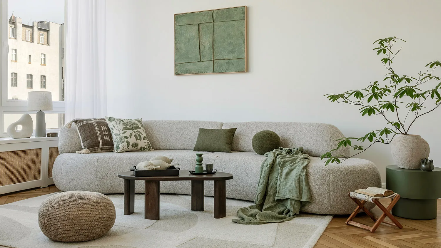 Серый фисташковый смягчает яркость зеленого и создает сбалансированный, сдержанный фон. Хорошо смотрится в гостиных, где выступает в роли собирающего цвета, объединяя функциональные зоны. Оттенок дружит с деревом, бетоном и матовым металлом. В северных помещениях цвет может казаться более холодным и строгим, тогда как южное солнце способно раскрыть в нем зеленоватые ноты и добавить жизни.