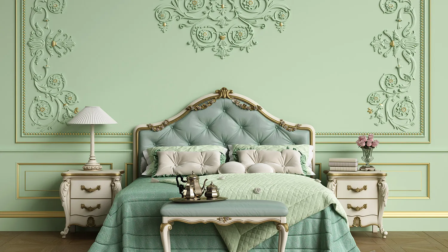 В классическом стиле фисташковый хорошо смотрится в отделке, на дверях, карнизах и фасадах мебели с резными деталями. Особенно выразительно цвет раскрывается в сочетании с кремовыми, бежевыми и золотистыми элементами. Они подчеркивают его природную мягкость и добавляют изысканности.