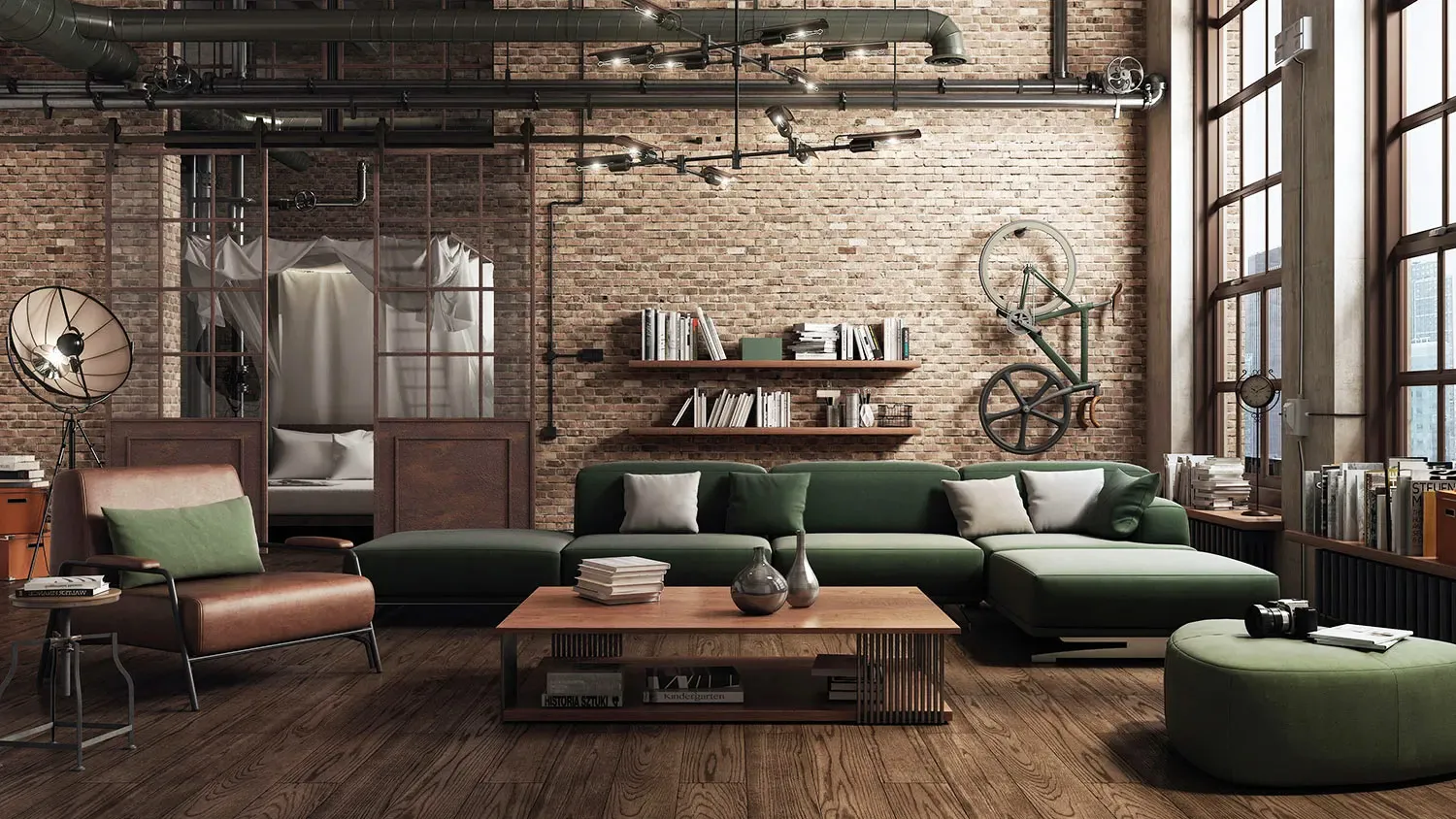 В брутальной эстетике лофта мягкий фисташковый с желтоватым или серым подтоном создает приятный контраст с грубыми фактурами: бетоном, кирпичом, металлом и необработанным деревом.
