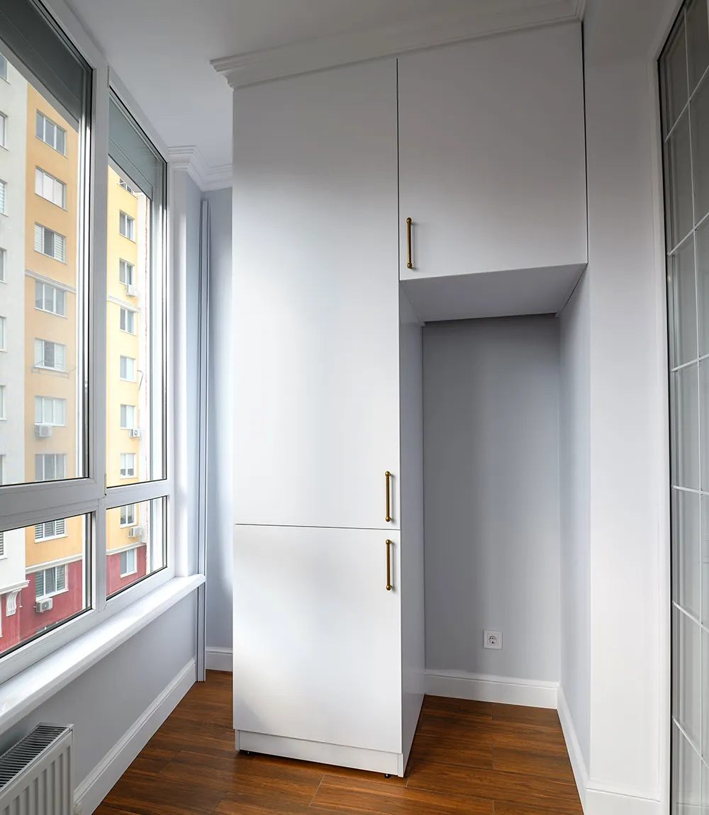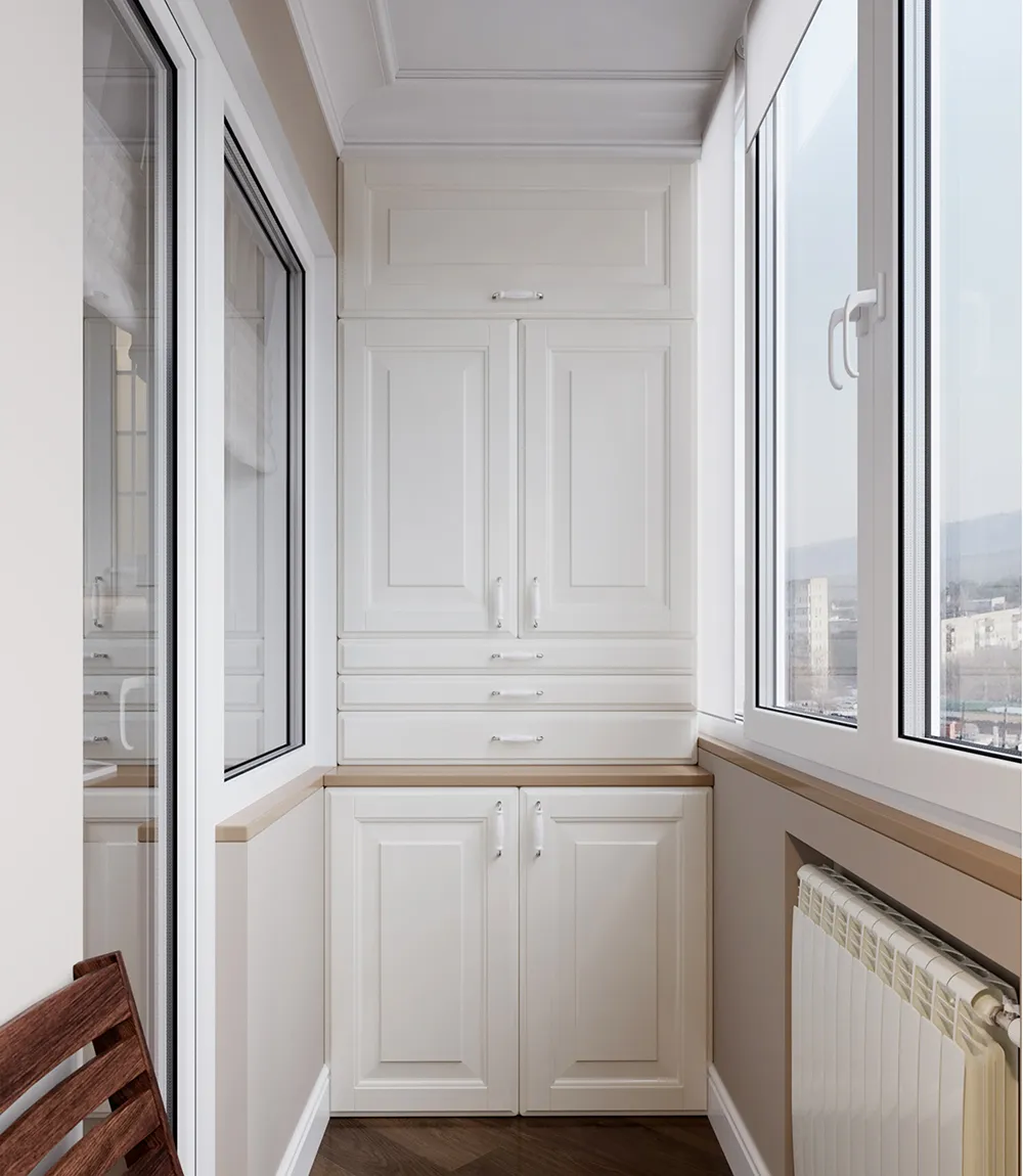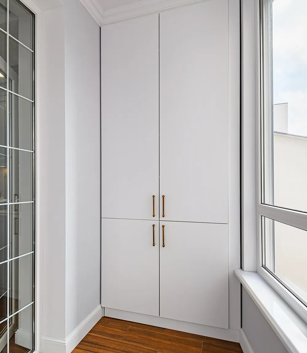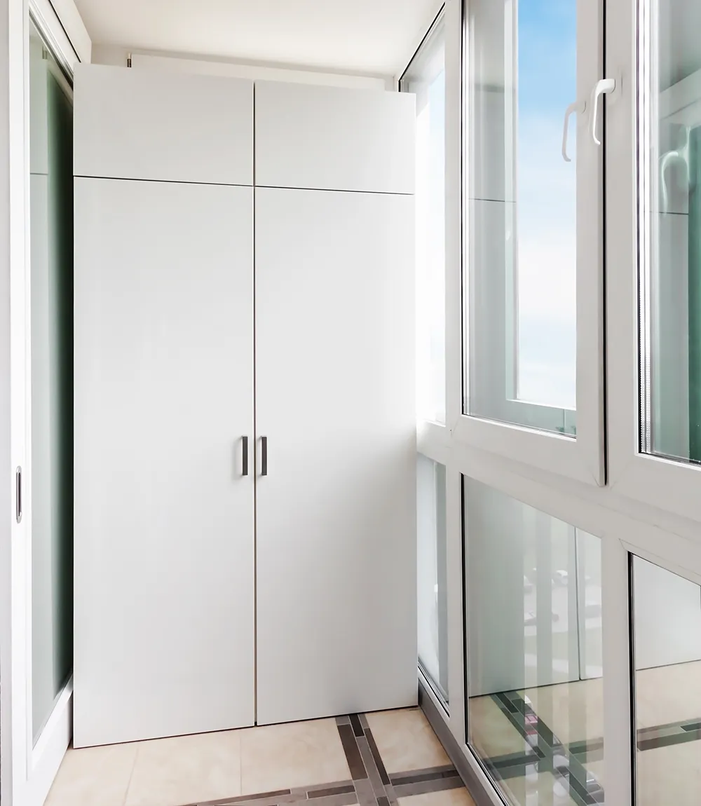 Еще один фактор, который напрямую влияет на расположение, — тип остекления. На холодных балконах шкаф предпочтительно ставить ближе к внутренней стене, подальше от оконных рам, где выше риск конденсата. На утепленных лоджиях пространство позволяет собрать шкаф вдоль любой стены.