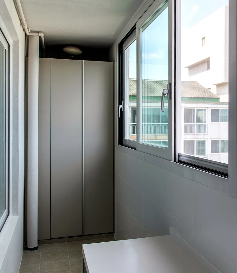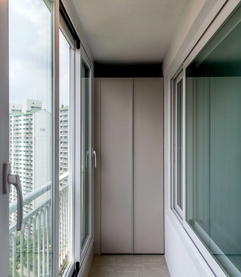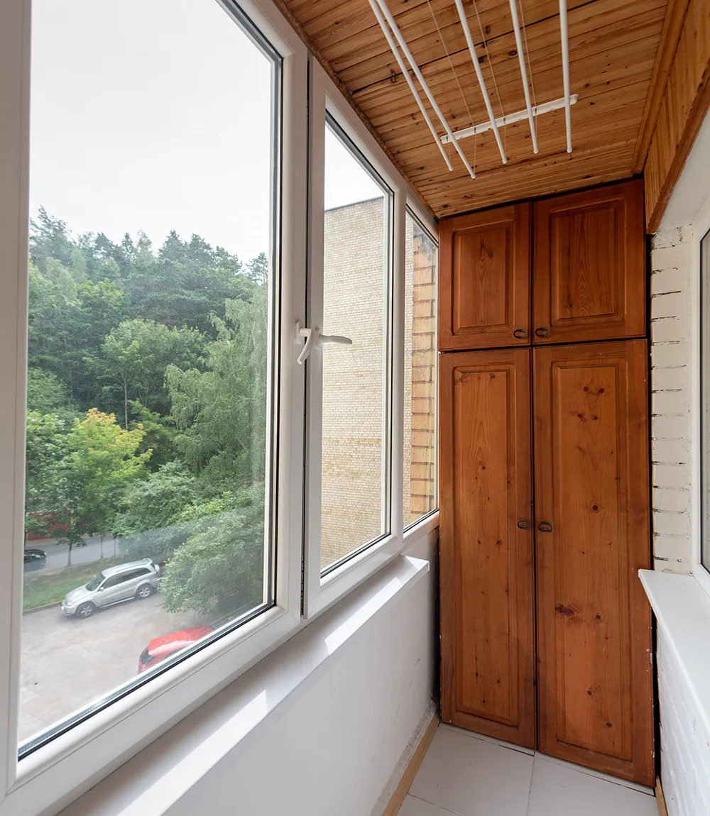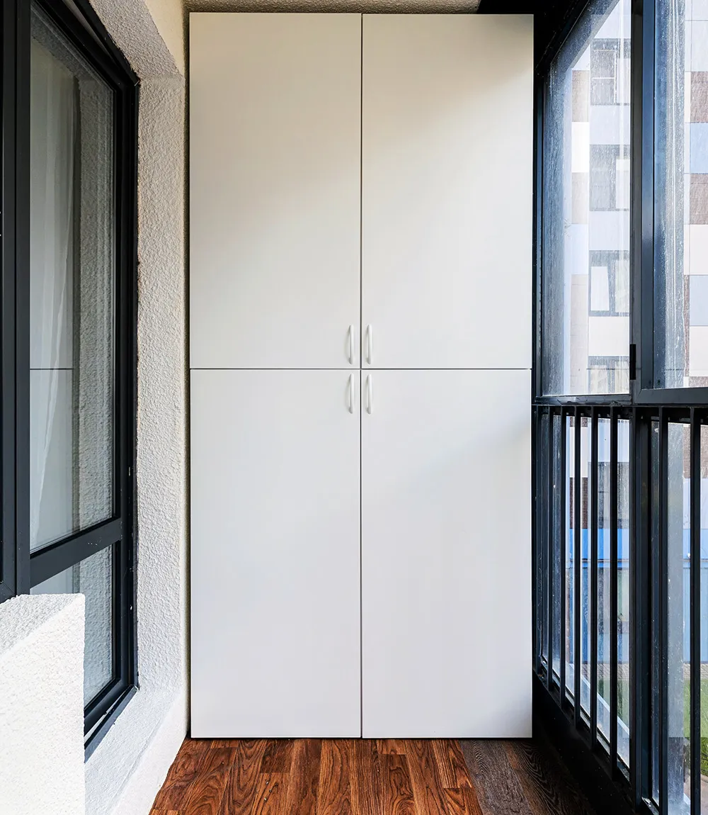 Еще один фактор, который напрямую влияет на расположение, — тип остекления. На холодных балконах шкаф предпочтительно ставить ближе к внутренней стене, подальше от оконных рам, где выше риск конденсата. На утепленных лоджиях пространство позволяет собрать шкаф вдоль любой стены.